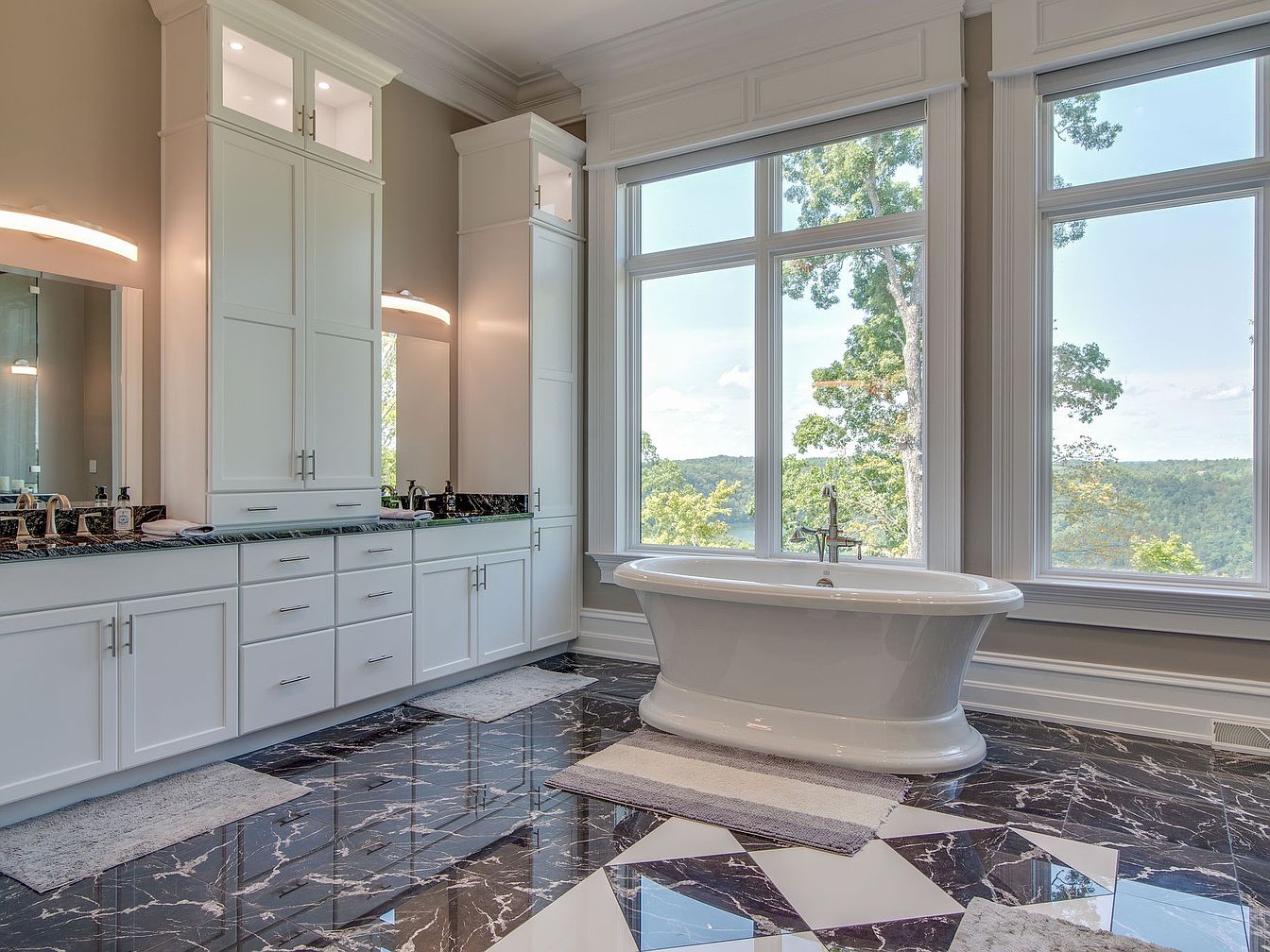 This elegant master bathroom balances modern comfort and timeless design, featuring a freestanding soaking tub positioned before expansive picture windows that welcome abundant natural light and offer scenic views. Dual vanities provide generous storage with crisp white cabinetry and black marble countertops, making morning routines easy for couples or families. Polished black marble floors with a bold geometric pattern add dramatic flair, subtly contrasted by plush gray bath mats for warmth underfoot. High ceilings and light taupe walls enhance the spacious, airy feel. Attention to both functionality and style ensures a welcoming atmosphere, perfect for relaxing or family use.