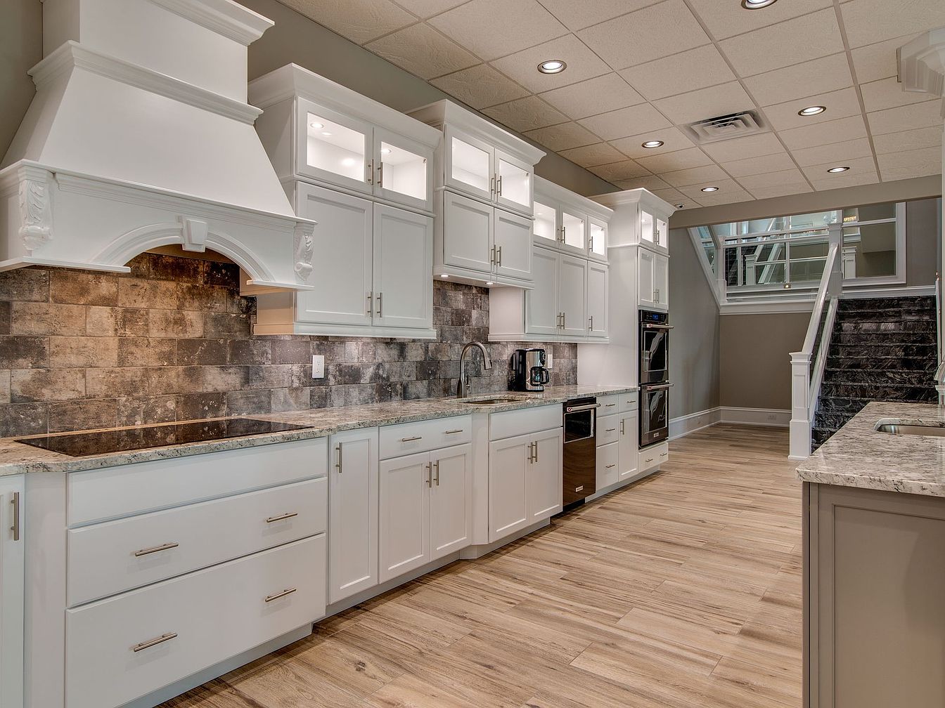 A modern kitchen showcases sleek white cabinetry with elegant crown molding, offering ample storage for family needs. The spacious granite countertop stretches along one side, ideal for meal prep or family activities, while a striking stone tile backsplash adds visual depth and texture. Stainless steel appliances—including double ovens, a dishwasher, and built-in stovetop—support efficient, family-friendly cooking. Under-cabinet lighting and ceiling spotlights create a bright, inviting atmosphere. The warm-toned, wood-style flooring enhances comfort and lends a natural touch. Nearby stairs and open sightlines to other rooms ensure seamless movement and supervision—perfect for the bustling environment of a family home.