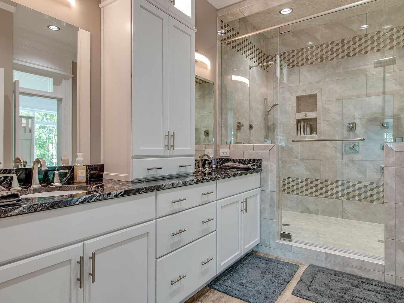 This spacious bathroom presents a modern yet inviting atmosphere, balancing luxury with everyday functionality. Featuring double sinks with marble countertops and ample under-counter cabinetry, the layout accommodates busy family mornings. The walk-in glass shower is elegantly tiled with geometric accent bands, creating visual interest while built-in shelves keep essentials organized and accessible for all ages. Soft gray hues dominate the color scheme, paired with crisp white cabinetry and sleek chrome fixtures to enhance the room’s clean, airy feel. Natural light streams in from a large window, while plush rugs add warmth and comfort underfoot, making this bathroom both stylish and family-friendly.