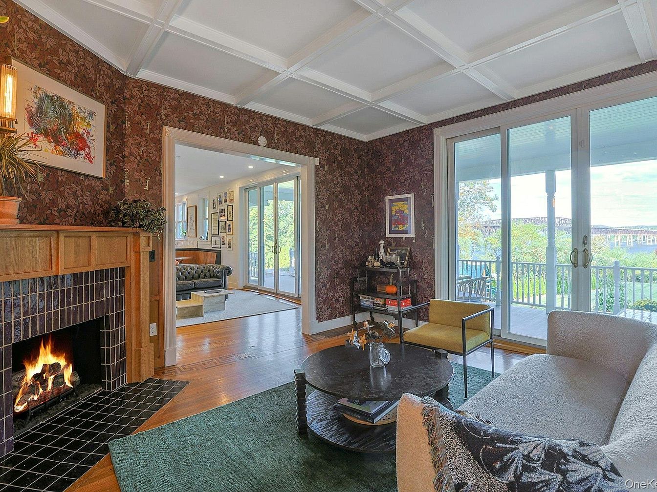 A cozy living room seamlessly opens onto a sunlit porch, perfect for family gatherings and relaxation. The space features a classic wood mantel and a tiled fireplace, bringing warmth and a welcoming ambiance. Rich, floral-patterned wallpaper pairs with crisp white coffered ceilings, creating an elegant yet homey atmosphere. Comfortable seating with a contemporary sofa, a plush accent chair, and a round coffee table encourages conversation. Large glass sliding doors offer scenic views and fill the room with natural light, enhancing the connection to the outdoors. Thoughtful decor, family photos, and vibrant artwork make the space lively and inviting for all ages.