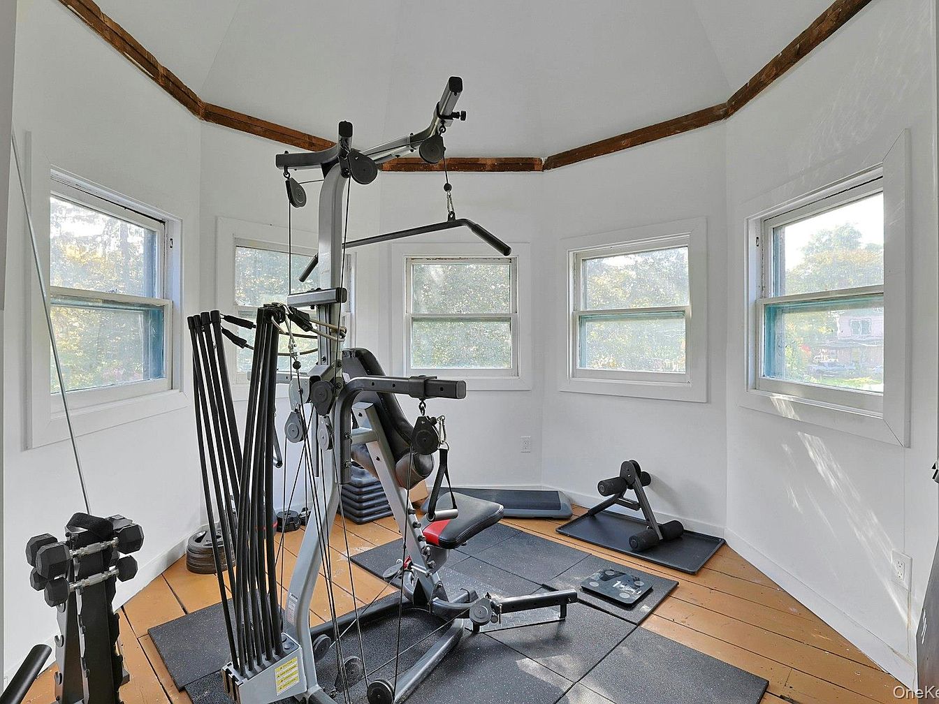 A bright and inviting home gym designed for family fitness, featuring natural light streaming through multiple windows on each wall. The crisp white walls and warm, honey-toned hardwood floors create a clean, energizing environment, while exposed wood beams add a rustic architectural touch. Centered in the space is a versatile multi-station exercise machine, surrounded by neatly organized free weights and mats, making it suitable for strength training, cardio, and stretching. The open layout ensures ample room for movement and group workouts, making this home gym an inspiring and practical solution for healthy living.