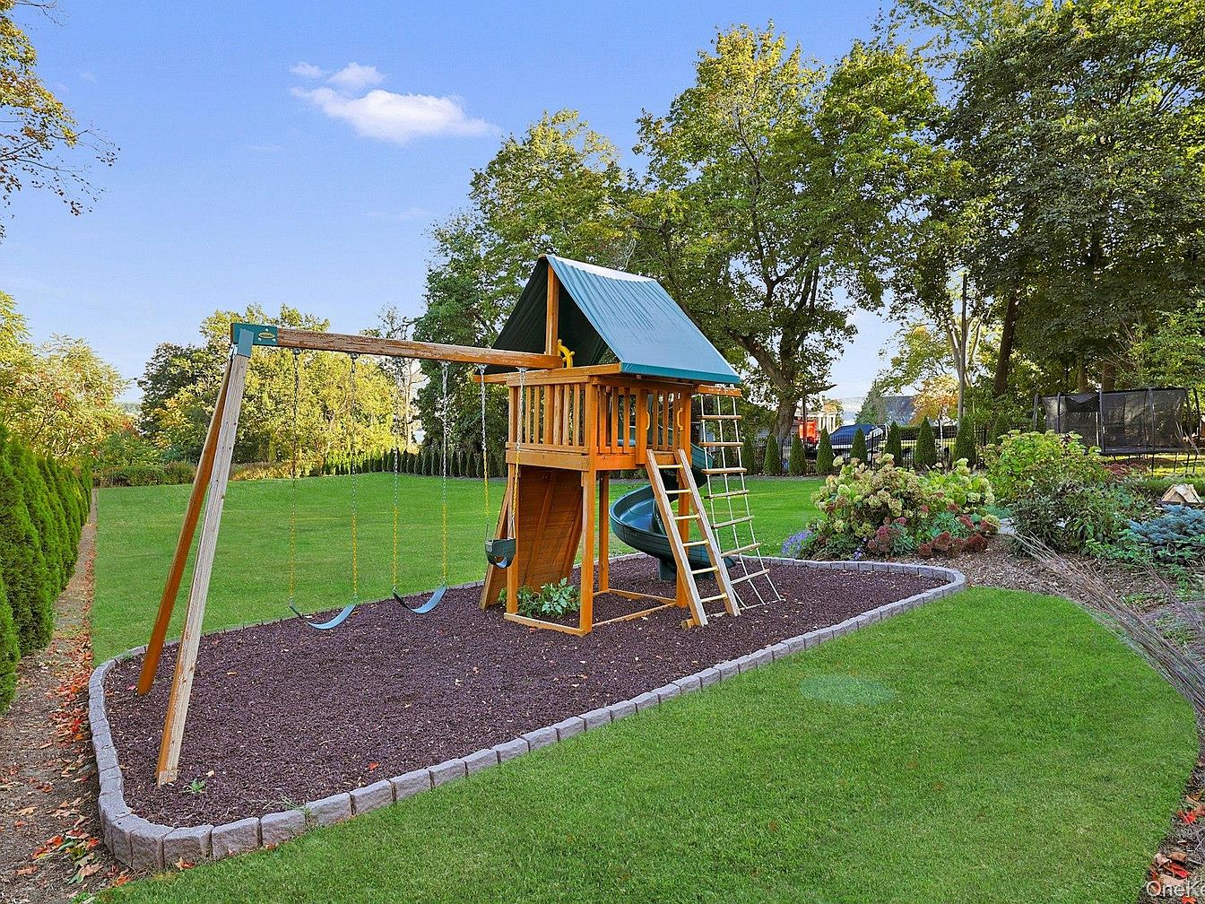 A spacious backyard features a thoughtfully designed wooden playset, complete with swings, a slide, a climbing wall, and a lookout fort, ensuring plenty of outdoor fun for children. The area around the playset is lined with mulch and bordered by decorative stone edging for added safety and visual appeal. Lush green grass surrounds the play space, blending seamlessly into colorful garden beds filled with flowering shrubs and mature trees that offer shade and privacy. This family-friendly backyard is ideal for outdoor gatherings, encouraging kids to explore and play while adults can enjoy the beautiful landscaping and tranquil atmosphere.