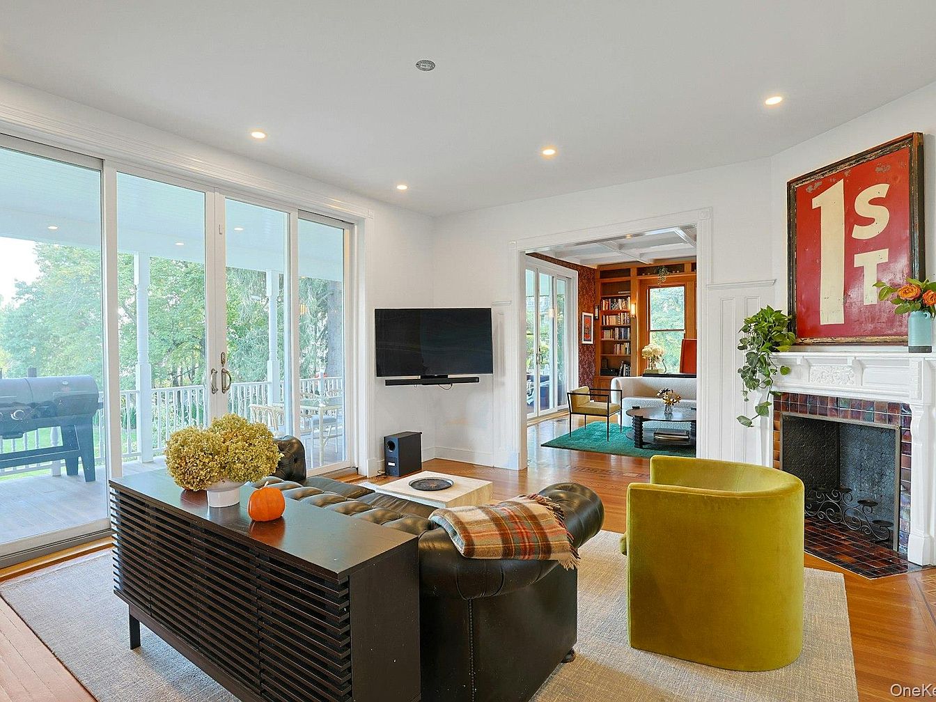 Spacious living room with large sliding glass doors that fill the space with natural light and provide easy access to a covered porch—perfect for family gatherings and indoor-outdoor flow. The cozy setting features a black leather Chesterfield sofa and a modern olive-green armchair atop a neutral area rug, contributing to a comfortable yet stylish look. A sleek wooden sideboard offers functional storage and display space for seasonal decorations. The striking white fireplace with decorative tile accents serves as a focal point, adorned with a vintage sign and fresh greenery, enhancing the home’s welcoming, family-friendly ambiance. Soft white walls and subtle recessed lighting ensure a bright, inviting feel throughout.