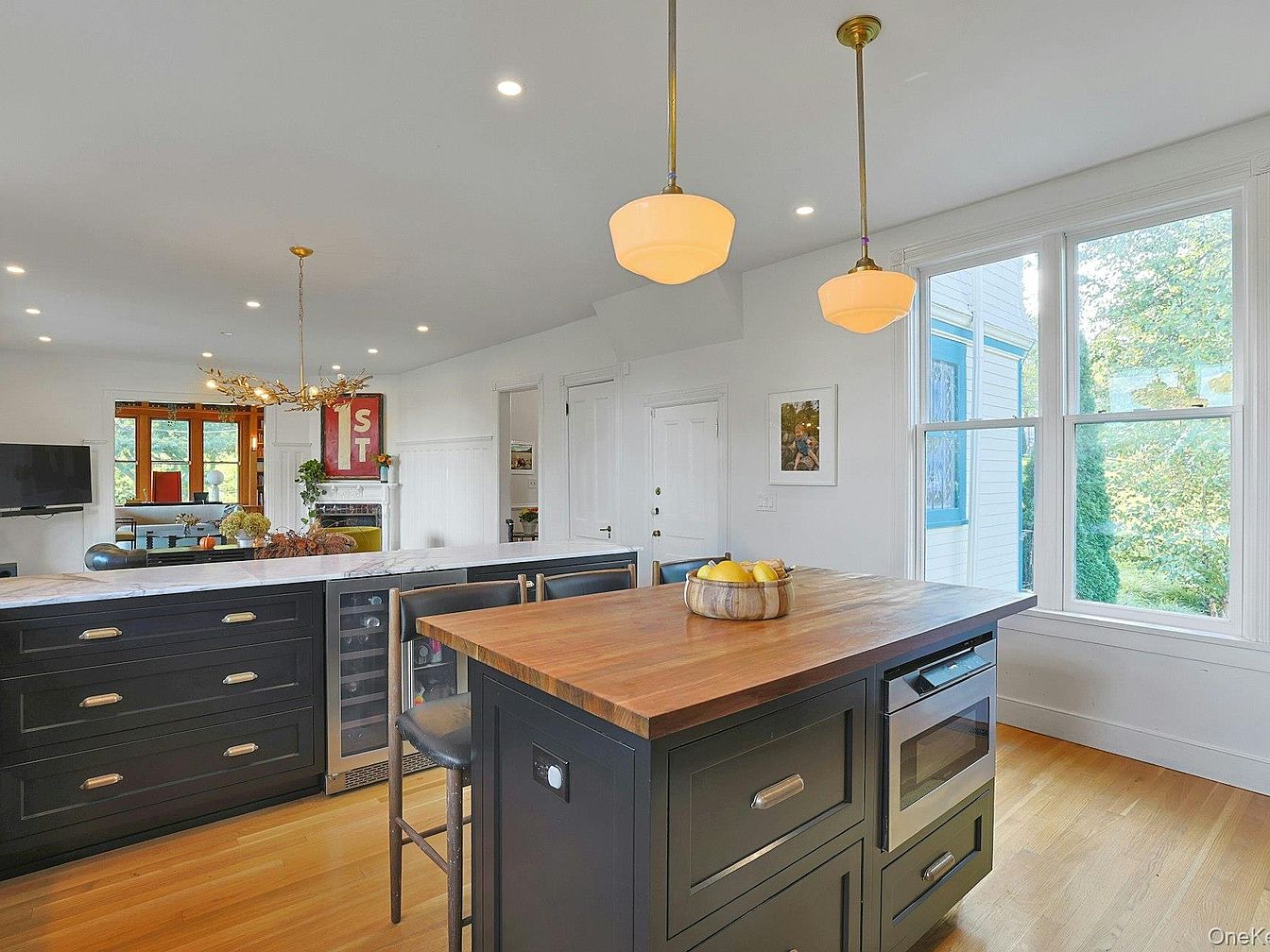 A spacious open-concept kitchen blends seamlessly with the living and dining areas, making it ideal for family gatherings or entertaining guests. The central kitchen island features a warm wood countertop, deep cabinetry in striking slate black, and a built-in oven, providing both functionality and style. Large windows invite natural light, creating a bright and welcoming atmosphere. Modern pendant lights hang above the island, complementing the gold-accented chandelier over the dining area. The room features hardwood floors, comfortable seating, and thoughtful touches like a wine cooler and ample storage, balancing sophistication with family-friendly practicality.
