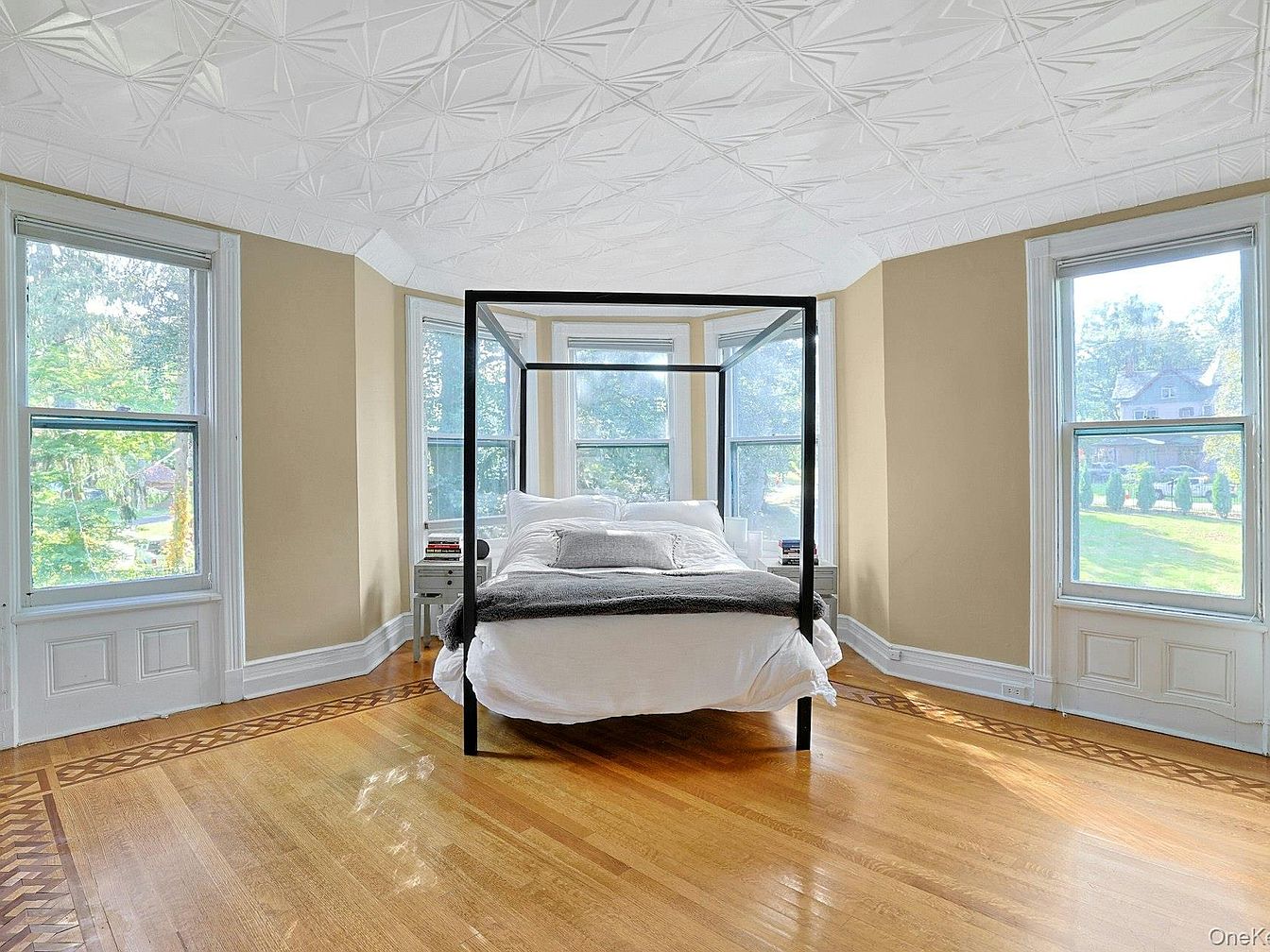 A spacious and sunlit primary bedroom features a dramatic four-poster bed, perfectly framed by three large bay windows that flood the space with natural light. The soft tan and white color palette creates a calming atmosphere, ideal for relaxation. Elegant white baseboards and window moldings add a touch of sophistication, while the meticulously detailed parquet border on the hardwood floor offers classic charm. Family-friendly and open, the room provides ample floor space for children or seating, while the cozy bed invites restful nights. The uniquely textured geometric ceiling elevates the room’s character, blending modern simplicity with timeless elegance.