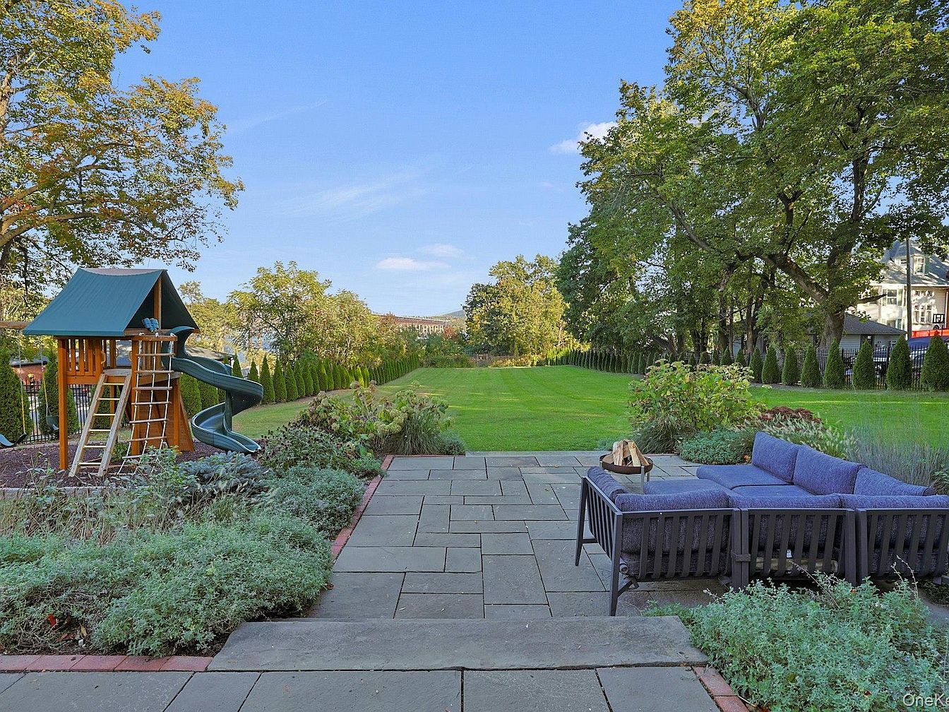 Expansive backyard with a beautiful stone patio opens up to a lush, manicured lawn framed by mature trees and privacy shrubs, creating a peaceful retreat for the entire family. A modern outdoor sectional with deep blue cushions surrounds a cozy fire pit, perfect for relaxing or social gatherings. Adjacent to the patio, a custom wooden playset featuring ladders and a twisty slide invites children to play safely under the shade. Low-maintenance greenery and thoughtfully arranged flowering shrubs border the patio, blending comfort and functionality, while the crisp blue sky enhances the fresh, inviting atmosphere for all ages.