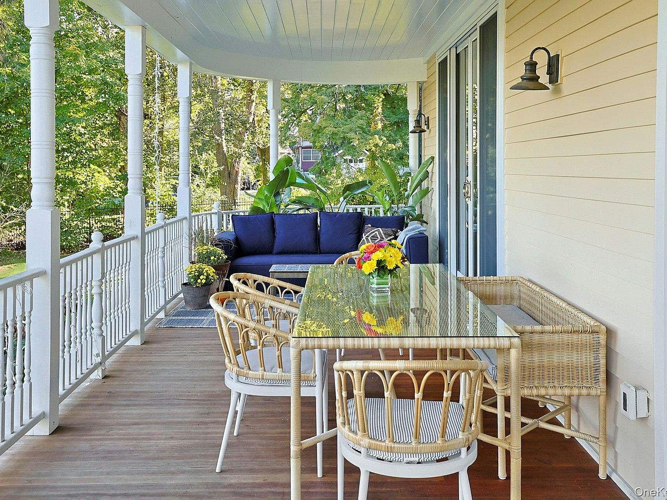 A spacious covered porch stretches along the back of the home, featuring classic white railings and turned posts that evoke timeless American charm. Warm-toned wood flooring pairs beautifully with the white ceiling, creating a fresh yet cozy ambiance. The porch is furnished with a glass-top dining table and wicker chairs, perfect for family meals and gatherings. A grill stands ready for outdoor cooking, and potted flowers add splashes of color by the entrance. The porch overlooks an expansive backyard with a playset, making it ideal for children, while the open views of trees and distant bridge invite relaxation for all ages.
