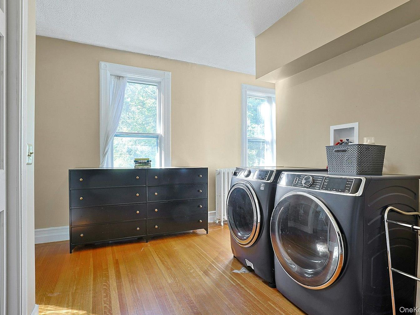 Bright and spacious laundry room featuring large front-loading washer and dryer set, set against a backdrop of warm beige walls and natural hardwood flooring. Generous natural light streams in from two tall windows, making the space welcoming and cheerful for family chores. The room includes a sleek black dresser, perfect for storing laundry essentials or folding clothes. Practical details like the woven laundry basket and ample floor space ensure functionality and easy movement, ideal for busy family routines. Simple white window trim and baseboards add classic architectural interest for a clean and organized look.