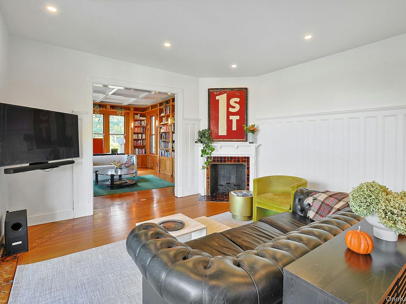 This inviting living room blends classic and contemporary aesthetics, featuring crisp white paneled walls, a cozy fireplace adorned with art, and ample natural light. Furnished with a plush black tufted leather sofa, a vibrant green accent chair, and a modern coffee table, the space is both stylish and comfortable for family gatherings. The mounted flat-screen TV and built-in speakers provide entertainment, while thoughtful touches like a throw blanket, potted plants, and decorative items create a welcoming ambiance. Large double doors open to a sunlit library lined with built-in shelves, encouraging reading and connection for all family members.