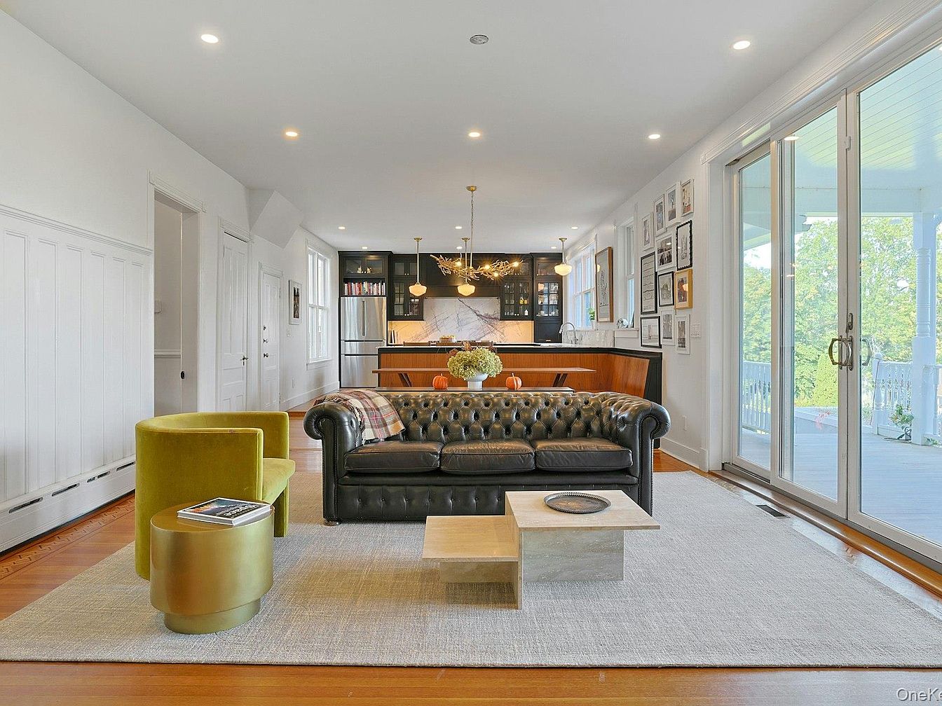This inviting living space showcases a harmonious blend of comfort and style, perfect for family gatherings and relaxed entertaining. Neutral walls keep the atmosphere bright, while the mid-century velvet armchairs and a classic tufted leather sofa create a cozy seating area centered on a soft area rug. Floor-to-ceiling windows provide abundant natural light and direct access to a spacious porch, encouraging indoor-outdoor living. The open-plan flow leads seamlessly to a modern kitchen, with warm wood accents, sleek cabinetry, and contemporary lighting. Art-filled walls and layered textures add personality, making this versatile area both practical and inspiring.