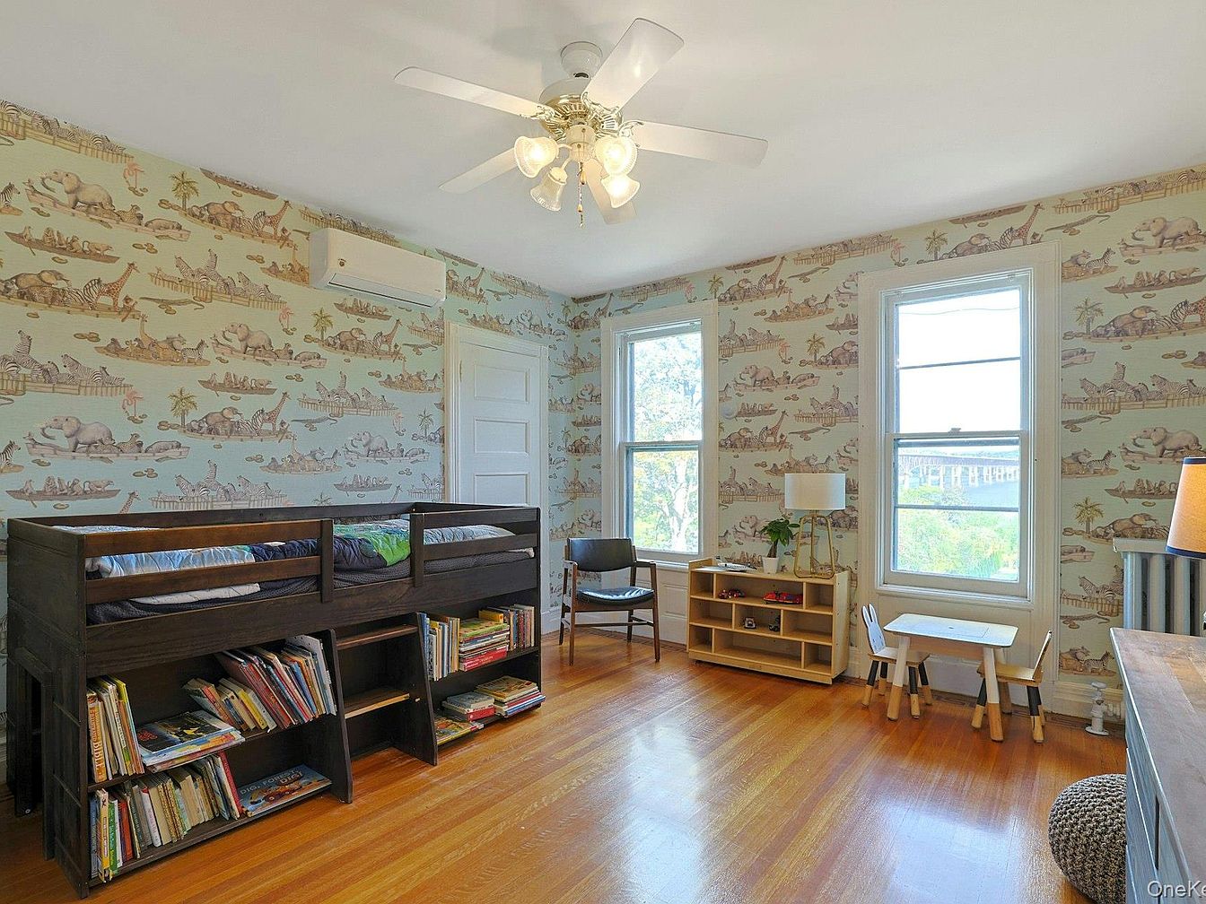 This spacious kid’s bedroom is thoughtfully designed for comfort and creativity, showcasing a warm wood floor and abundant natural light from tall, double-pane windows. The walls are wrapped in playful animal-themed wallpaper, adding a lively touch that appeals to children and makes the space feel inviting. A dark wood loft bed with built-in bookshelves offers ample storage for books and toys, encouraging organized play and reading. The room features a cozy reading nook, child-sized play table, and accessible furniture, making it perfect for learning and imaginative activities. A modern ceiling fan and soft lighting complete the family-friendly, cheerful atmosphere.