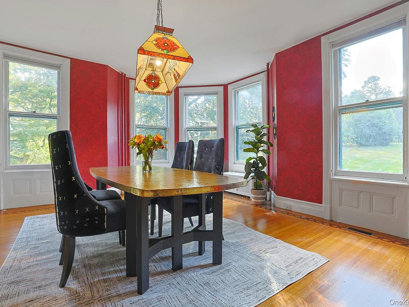 A bright, inviting dining area features large bay windows that fill the space with natural light and offer unobstructed garden views, creating an open and airy atmosphere. The walls are adorned with bold red wallpaper, adding warmth and vibrancy, balanced by crisp white moldings. A sturdy wooden table with a natural finish is surrounded by four tall upholstered chairs that feature subtle cross-stitch detailing for a touch of elegance. Family meals feel special under the striking, stained-glass pendant light overhead. A neutral area rug defines the dining space, while a fresh bouquet and potted plant add life and a welcoming feel.