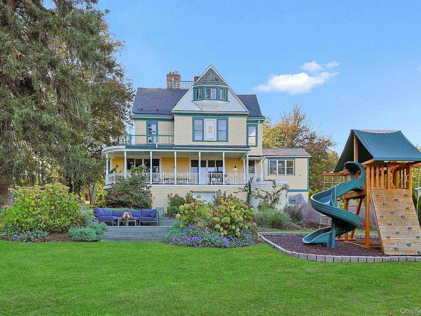 A spacious backyard combines traditional elegance with family-focused design. The home features classic American Victorian architecture, complete with a wrap-around porch and pastel yellow siding trimmed in teal and white. The lush green lawn provides ample space for play, while beautifully landscaped garden beds frame the patio area. Comfortable outdoor seating surrounds a fire pit, perfect for family gatherings or entertaining guests. To one side, a thoughtfully integrated play structure with a winding slide and climbing wall creates a haven for children, offering endless fun and activity within view. The overall setting is warm, inviting, and ideal for cherished family moments.