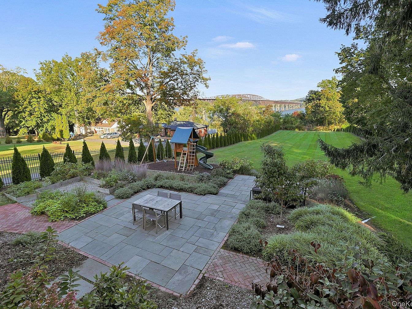 Expansive backyard highlighted by a large stone patio, perfect for family gatherings or outdoor dining, with a modern table and chairs at its center. The patio is edged with lush landscaping and raised garden beds, adding vibrant greenery and texture throughout the space. Beyond the patio, a spacious, well-maintained lawn stretches out, offering ample room for children and pets to play. Featuring a wooden playset with swings and a slide, the space is designed for family fun and safety. A backdrop of mature trees and privacy hedges creates a serene ambiance and a natural boundary for the property.
