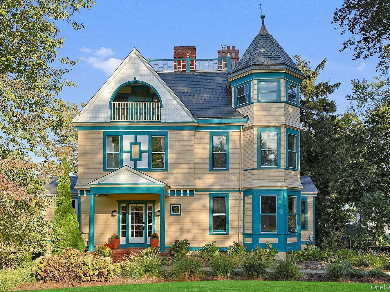 A beautifully preserved Victorian-style home stands out with its striking blue trim and creamy tan shingle siding. The architectural design features a charming covered entryway, an inviting balcony above, and an elegant corner turret with multiple windows that provide expansive views and bring in abundant natural light. Family-friendly landscaping includes a lush front lawn and mature plantings, ideal for outdoor activities. Symmetrical window arrangements and varied rooflines add character while the bold color accents offer a vibrant, welcoming curb appeal. This home blends historic charm with playful, timeless aesthetics, creating an inviting impression for guests and family alike.