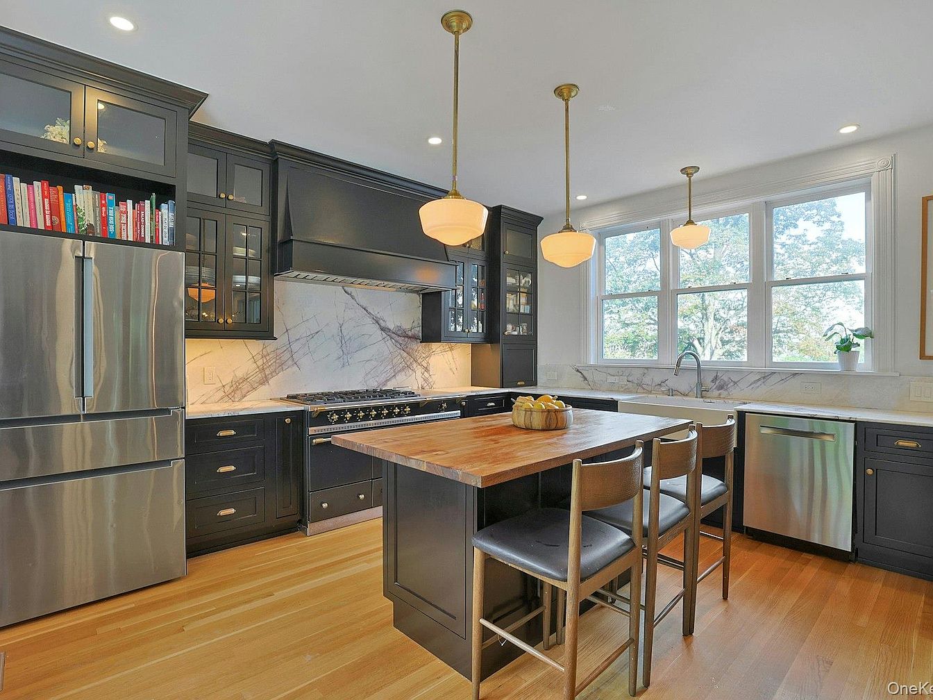 A spacious kitchen balances modern style with family-friendly functionality, featuring a large wooden island perfect for casual meals, homework, or socializing. Matte black cabinets with glass fronts add elegance while open shelving displays colorful cookbooks. A stainless steel refrigerator and dishwasher enhance practicality, complemented by a professional-grade range and marbled backsplash for a luxurious touch. Warm, natural wood floors contrast beautifully with the dark cabinetry, creating a welcoming atmosphere. Large windows allow for ample natural light, making the space bright and inviting. Thoughtful pendant lighting above the island ensures the heart of this home is both practical and visually stunning.