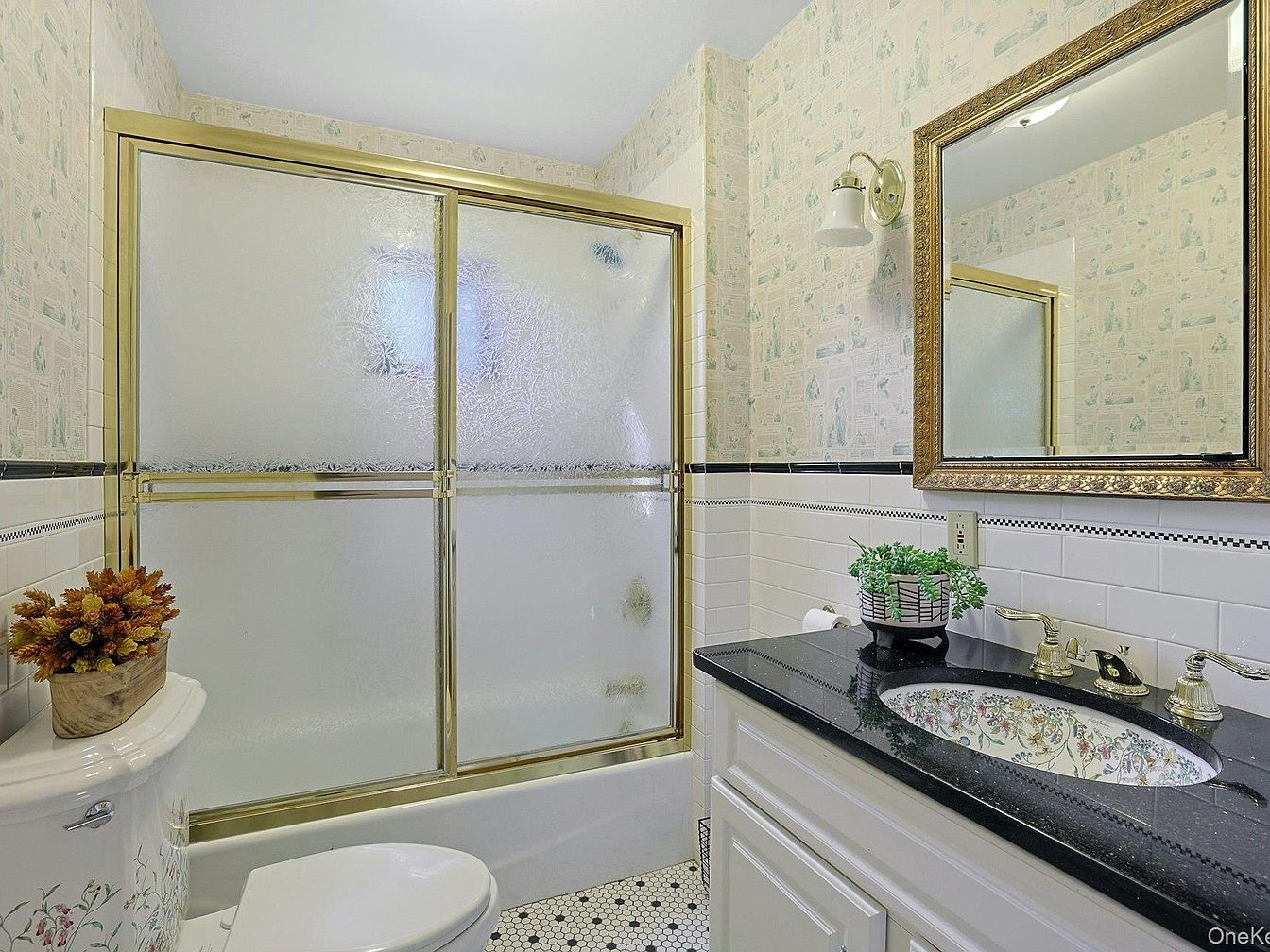 A bright and welcoming bathroom features a frosted glass shower with gold trim, providing both privacy and a touch of elegance. The black granite countertop contrasts beautifully with fresh white cabinetry, and an ornate gold-framed mirror adds vintage flair. Subtle wallpaper with historic motifs complements glossy white tile, while a black mosaic border runs along the wall for visual interest. Family-friendly details include a sturdy step-in tub-shower combo and accessible countertop space. Cheerful, nature-inspired accents, like floral arrangements and potted greenery, bring warmth and comfort to the space, making it inviting for guests and household members alike.