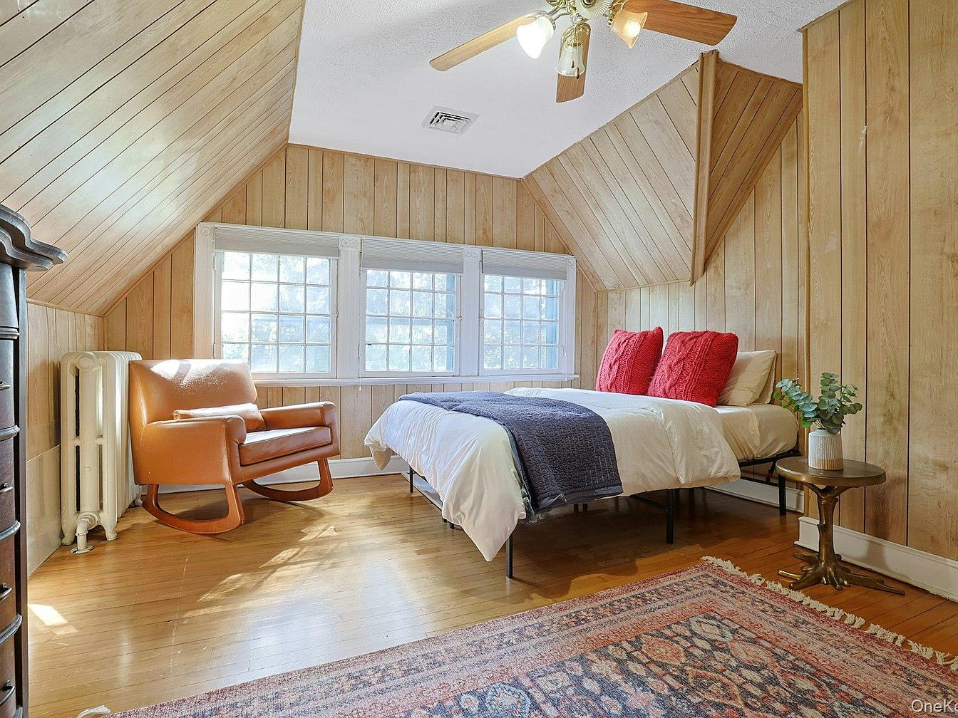 A charming attic bedroom featuring warm wood-paneled walls and sloped ceilings that create a snug, inviting atmosphere. Natural light pours in through a wide bank of windows, brightening the space and highlighting the honey-toned hardwood floors. The room is thoughtfully arranged with a comfortable bed dressed in crisp white linens, accentuated by bold red pillows and a textured navy throw. A mid-century modern rocking chair adds both style and a family-friendly space for reading or relaxing. Touches of greenery on a sleek round table and a richly patterned vintage rug bring softness and personality to the overall design.