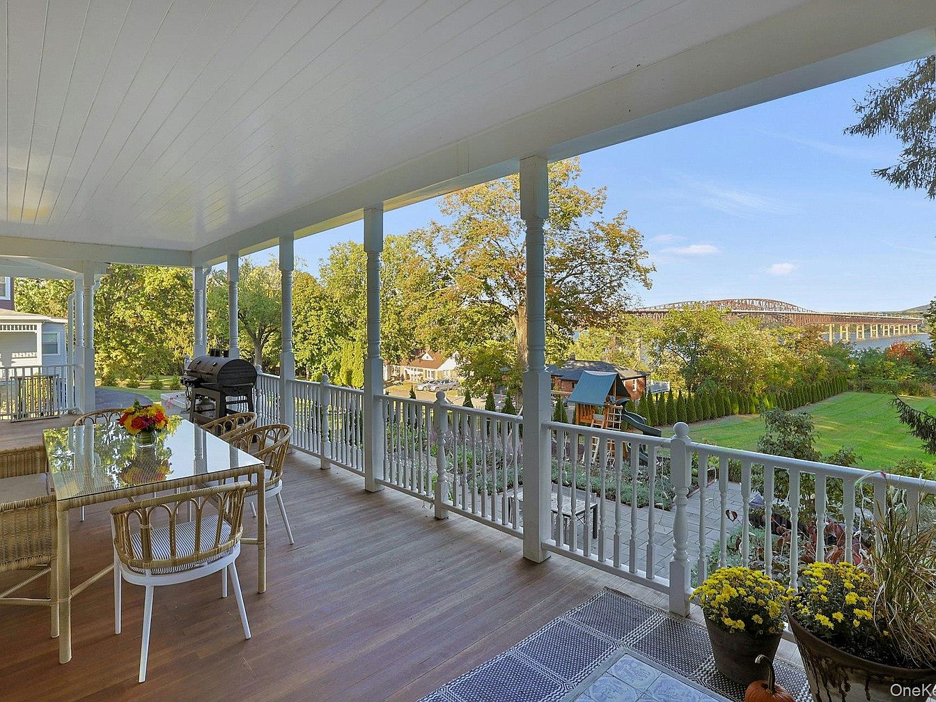A spacious covered porch stretches along the back of the home, featuring classic white railings and turned posts that evoke timeless American charm. Warm-toned wood flooring pairs beautifully with the white ceiling, creating a fresh yet cozy ambiance. The porch is furnished with a glass-top dining table and wicker chairs, perfect for family meals and gatherings. A grill stands ready for outdoor cooking, and potted flowers add splashes of color by the entrance. The porch overlooks an expansive backyard with a playset, making it ideal for children, while the open views of trees and distant bridge invite relaxation for all ages.