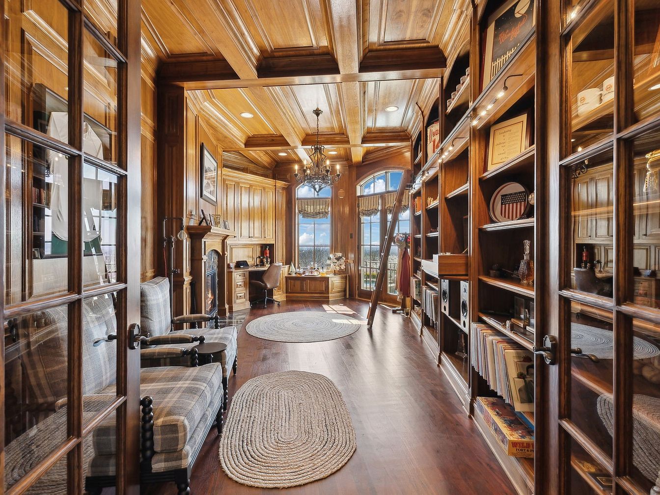 Warm wooden paneling envelops this home library, creating a cozy yet sophisticated ambiance perfect for quiet study or family gatherings. A prominent wall of built-in bookshelves houses a diverse collection of books and cherished memorabilia, while a rolling ladder adds both function and charm. Plump, plaid-upholstered armchairs provide comfortable seating for reading or conversation. An elegant fireplace anchors the room, enhancing the inviting atmosphere. Light streams in through arched windows and glass French doors, illuminating the classic decor and highlighting the intricate ceiling design. Durable rugs and thoughtful layout make this a welcoming, family-friendly space for all ages.