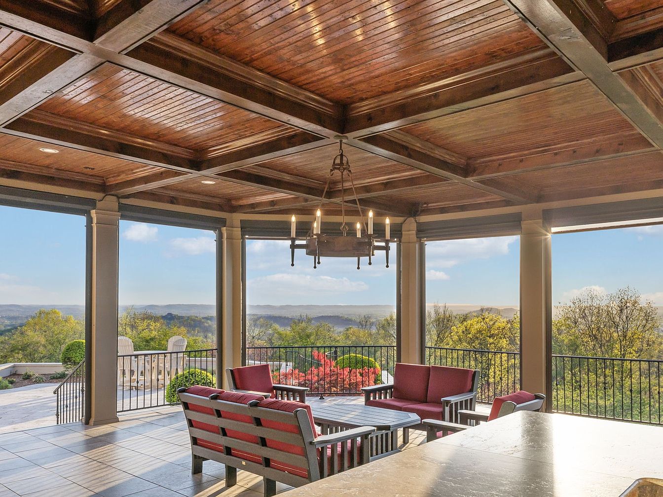 This expansive covered patio creates an inviting outdoor living space that seamlessly blends comfort with nature. The richly stained wooden ceiling with coffered beams adds warmth and sophistication, while the open layout offers unobstructed views of rolling hills and lush landscape. Cozy, deep-red cushioned seating forms a social gathering area around a coffee table, perfect for family conversations or entertaining guests. The sturdy columns and spacious tiled flooring provide both elegance and durability, making this area ideal for kids and adults alike. A stylish chandelier overhead lends a touch of rustic charm and ambient lighting as day turns to evening.