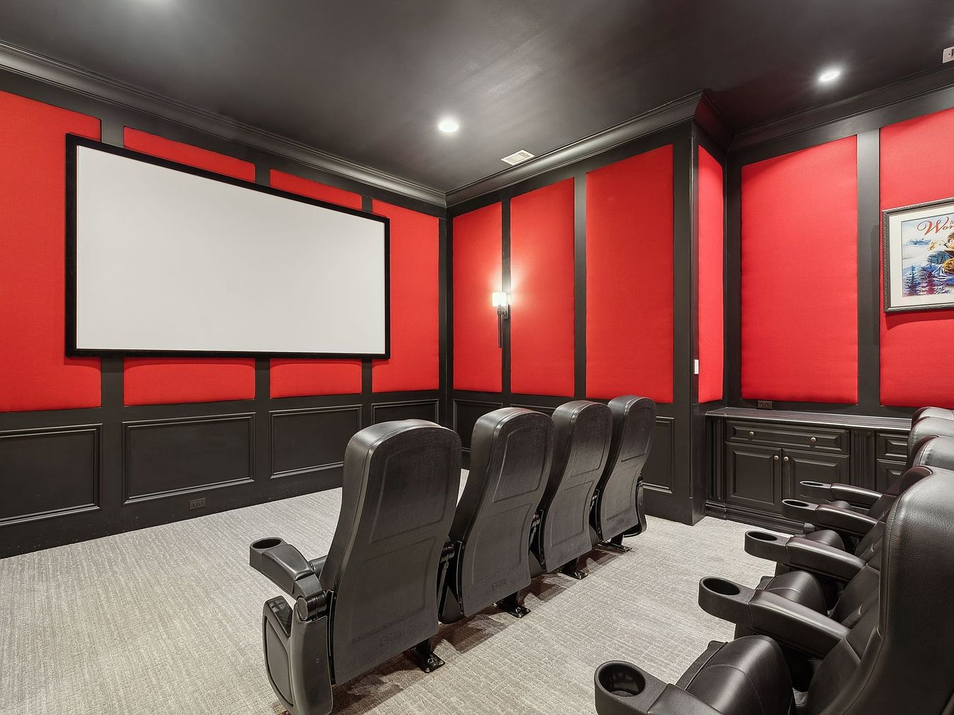 A dedicated home theater room with dramatic red wall panels contrasted by black wainscoting and trim creates a cinematic atmosphere. Comfortable black leather recliner seats, arranged in two rows, offer ample space for family and friends to enjoy movie nights together. The front of the room features an extra-large projection screen, perfect for immersive viewing. Plush light gray carpeting adds warmth underfoot and balances the bold wall colors. Built-in cabinetry at the back provides storage for media equipment and snacks, while recessed lighting and sconces enhance the ambiance, making this room both welcoming and functional for all ages.