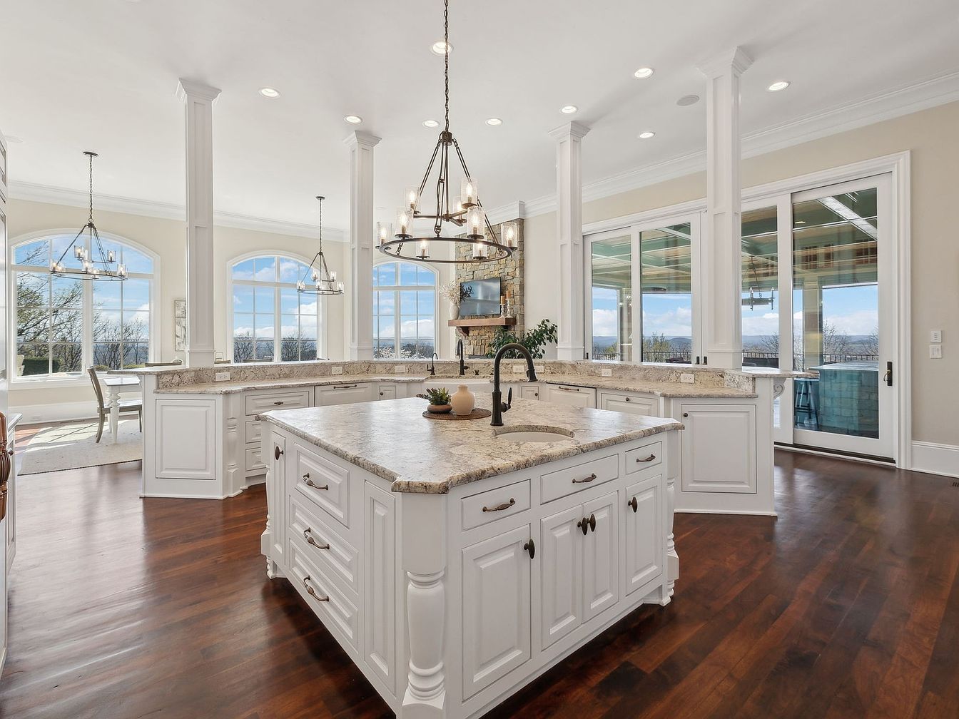 A bright, airy kitchen centerpiece features an expansive marble-topped island with plenty of storage and seating, ideal for meal prep and family gatherings. Surrounded by crisp white cabinetry and elegant columns, the space blends seamlessly into an open-concept dining area and a sun-filled living zone, enhanced by oversized floor-to-ceiling windows that capture sweeping outdoor views. Warm hardwood floors anchor the space, while bronze fixtures and a dramatic chandelier add a timeless touch. The open layout supports easy movement and togetherness, making it perfectly suited for family life and entertaining in style.