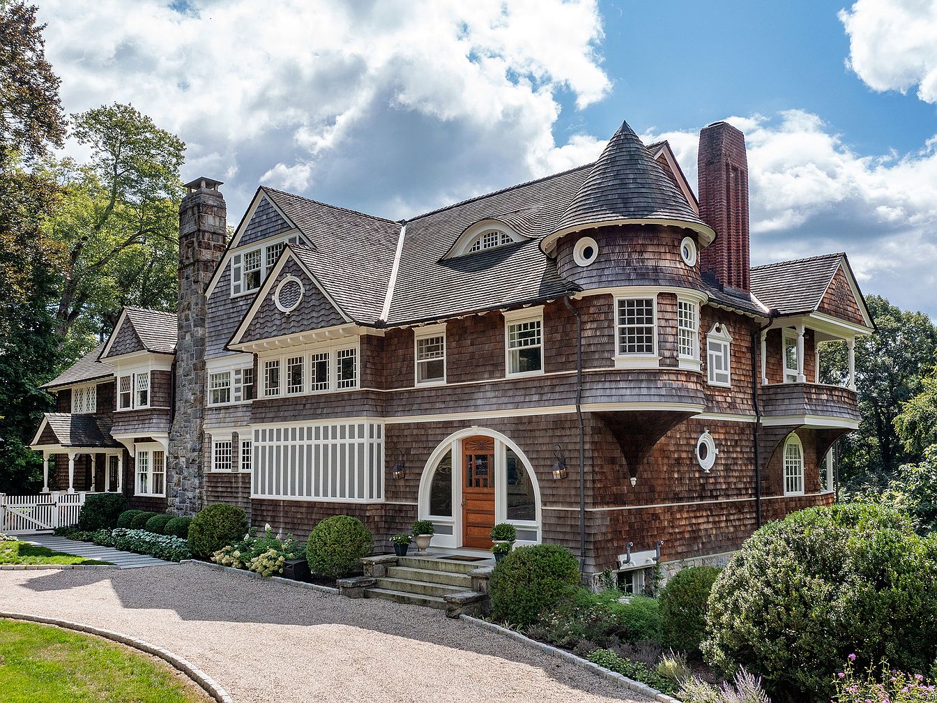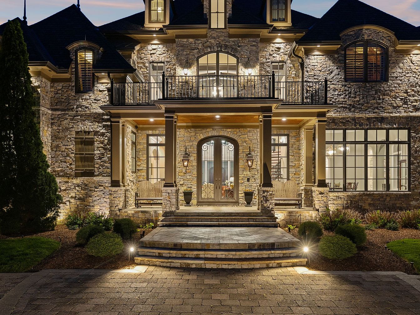A grand stone façade showcases an impressive front porch, featuring wide steps that gently rise to inviting double doors with ornate iron accents. The porch itself is framed by sturdy columns and warm ambient lighting, enhancing the home’s elegant curb appeal. Comfortable wooden benches provide a welcoming and family-friendly touch, perfect for gathering or relaxing outdoors. Manicured shrubbery and neatly paved walkways soften the stonework and blend seamlessly with the lush landscaping, while symmetrical balconies and large windows offer a glimpse inside, highlighting both the architectural sophistication and inviting warmth of this stunning American residence.