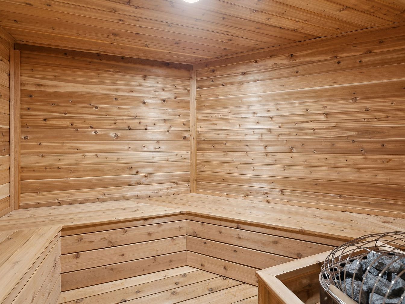 Warm cedar paneling lines the walls, ceiling, and benches of this inviting sauna, creating a cozy, tranquil setting ideal for relaxation. The natural wood grain and light honey tones contribute to an airy yet intimate atmosphere. Built-in benches offer ample seating for family or guests to gather, fostering connection and wellness. The corner design maximizes usable space, achieving both comfort and practicality. A built-in heater with smooth stones promises an authentic spa experience at home. The minimalist, clutter-free design ensures safety and makes cleaning simple, making it an excellent choice for family-friendly luxury and rejuvenation.