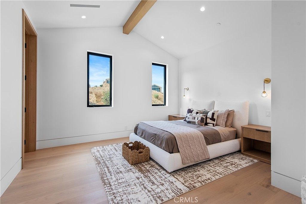 A peaceful, airy primary bedroom features a lofty vaulted ceiling highlighted by an exposed wood beam. Large windows frame beautiful landscape views while letting in natural light, and neutral tones create a tranquil and inviting atmosphere. Soft, earthy hues dominate the color scheme, from the light wood floors to the taupe bedding and cozy, textured rug. Two modern nightstands and matching wall-mounted pendant lights offer symmetry and practicality. The uncluttered layout enhances a sense of spaciousness, perfect for relaxation. Family-friendly features include plush bedding, warm wood accents, and a versatile basket for storage or kids’ essentials on the rug.