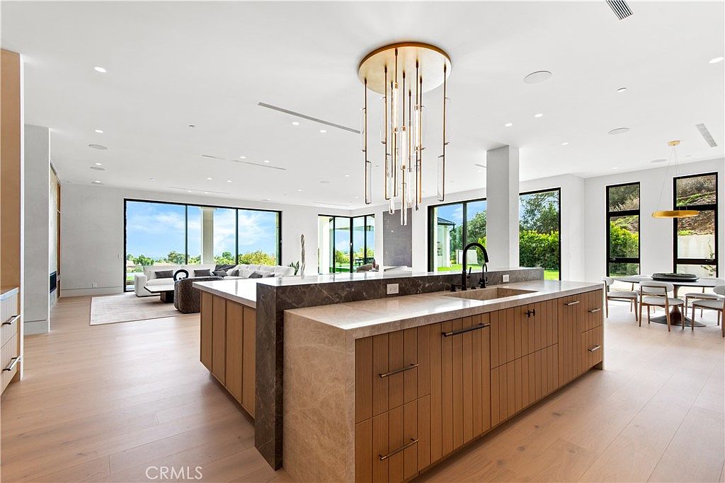 A stunning open-concept kitchen island anchors the main living area, seamlessly connecting the expansive living room and dining space. The contemporary island boasts natural wood cabinetry with sleek horizontal pulls and a luxurious stone countertop, complemented by a striking modern chandelier overhead. Panoramic floor-to-ceiling windows flood the space with natural light and offer serene garden views, enhancing the fresh, airy feel. The neutral, soft-toned color palette is warm and inviting, ideal for gatherings. Clean architectural lines, uncluttered surfaces, and smooth integration of cooking, dining, and lounging zones make this layout perfect for families and entertaining guests.