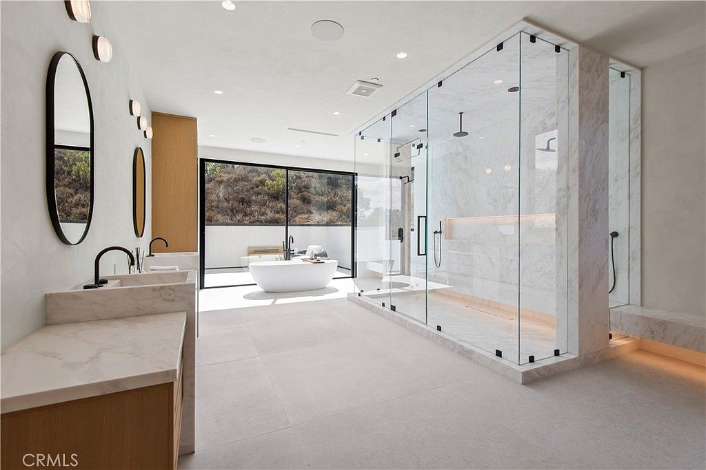 This spacious bathroom features a serene, open layout with ample natural light streaming in through a wall of sliding glass doors. The centerpiece is a freestanding soaking tub, perfectly positioned for relaxation while offering outdoor views. Elegant double sinks with marble countertops and sleek matte-black fixtures line one side, paired with tall, minimalistic mirrors and gentle wall lighting. A vast walk-in glass shower showcases rain showerheads and a built-in marble bench, making it ideal for family use or shared routines. A neutral palette of white, cream, and light wood ensures a calming, spa-like ambiance with sophisticated, modern detailing throughout.