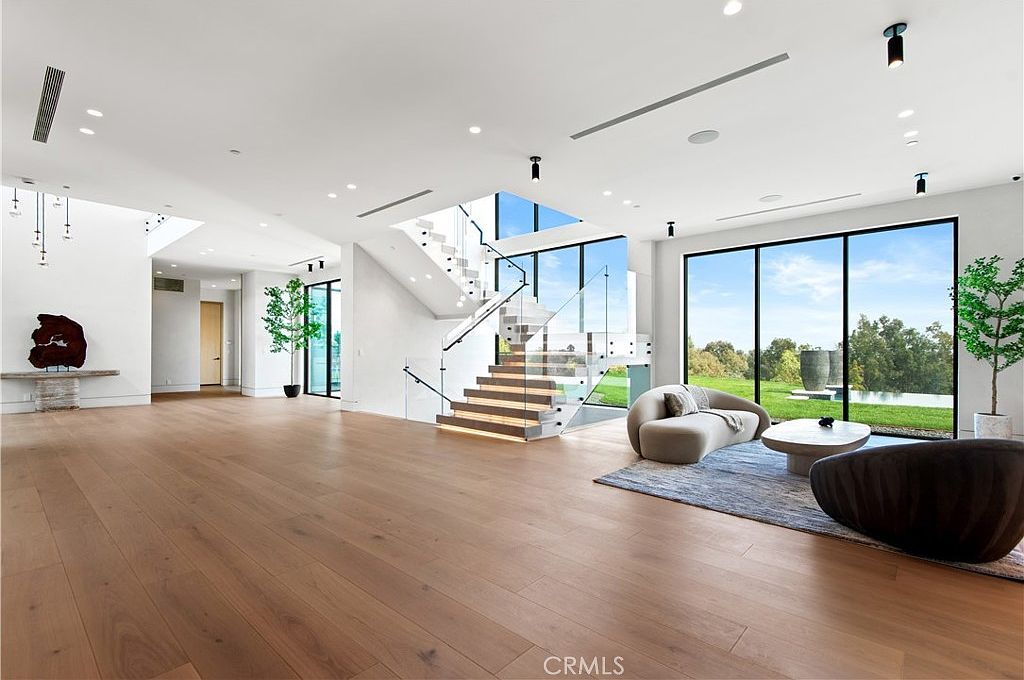 Expansive living area featuring clean architectural lines and a floating wood staircase with glass railings as a stunning centerpiece. Minimally furnished with contemporary seating arranged around a round coffee table, the space is wrapped in serene neutrals and soft grays, accentuated by ample natural light from the floor-to-ceiling windows that open onto lush outdoor views. Wide plank hardwood flooring adds warmth and elegance, while tall ceilings and subtle recessed lighting create an airy, inviting setting perfect for families. Large potted plants and simple wall art infuse freshness and personality without clutter, striking a balance between modern sophistication and comfort.