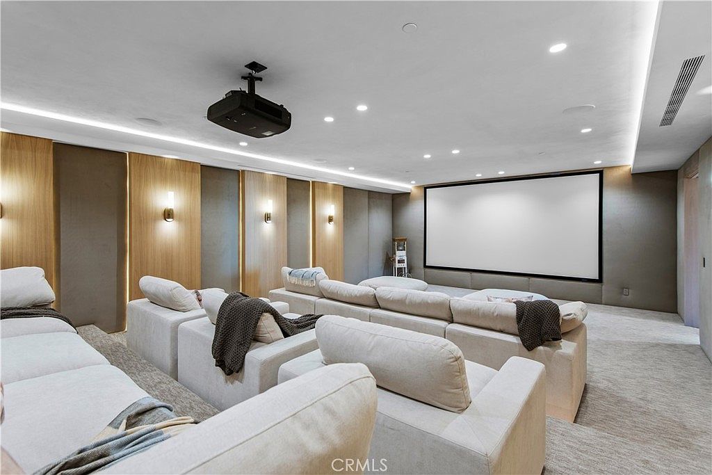 A spacious, state-of-the-art home theater designed for ultimate family entertainment. The room features tiered plush sectional sofas arranged for optimal viewing, each with cozy throws for added comfort. Soft neutral tones dominate the space, with beige walls, light carpeting, and subtle accent lighting that provides a warm, inviting glow. The modern built-in wall sconces, sleek projector, and a large wall-mounted screen create an immersive cinematic experience. The layout encourages togetherness, with generous seating allowing friends and family to gather for movie nights or game days. The space exudes luxury and relaxation, ideal for all ages.