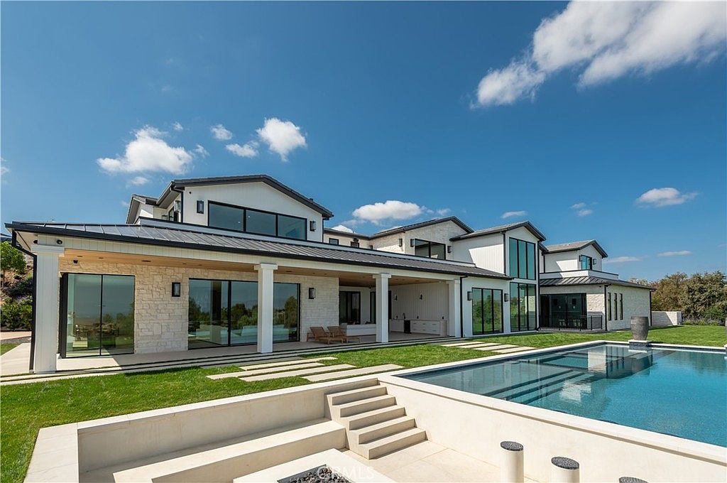 This newly constructed Hidden Hills estate epitomizes status and historical appeal, situated in one of Southern California’s premiere guard-gated communities renowned for security and exclusivity. Perfect for the future-oriented achiever, the property blends contemporary architecture with effortless indoor-outdoor living on a large private lot, capturing breathtaking pastoral and city-lights views. Built recently, its open-plan design centers around a chef’s kitchen, luxurious entertaining spaces, and serene wellness amenities, from a custom office to a plush home theater, gym, spa, and more, secured by 24-hour guard presence. With multiple structures, including a guest house and barn, this $23,750,000 estate offers grand sophistication, renowned schools nearby, and vast outdoor recreational features, all within a peaceful yet prestigious enclave.