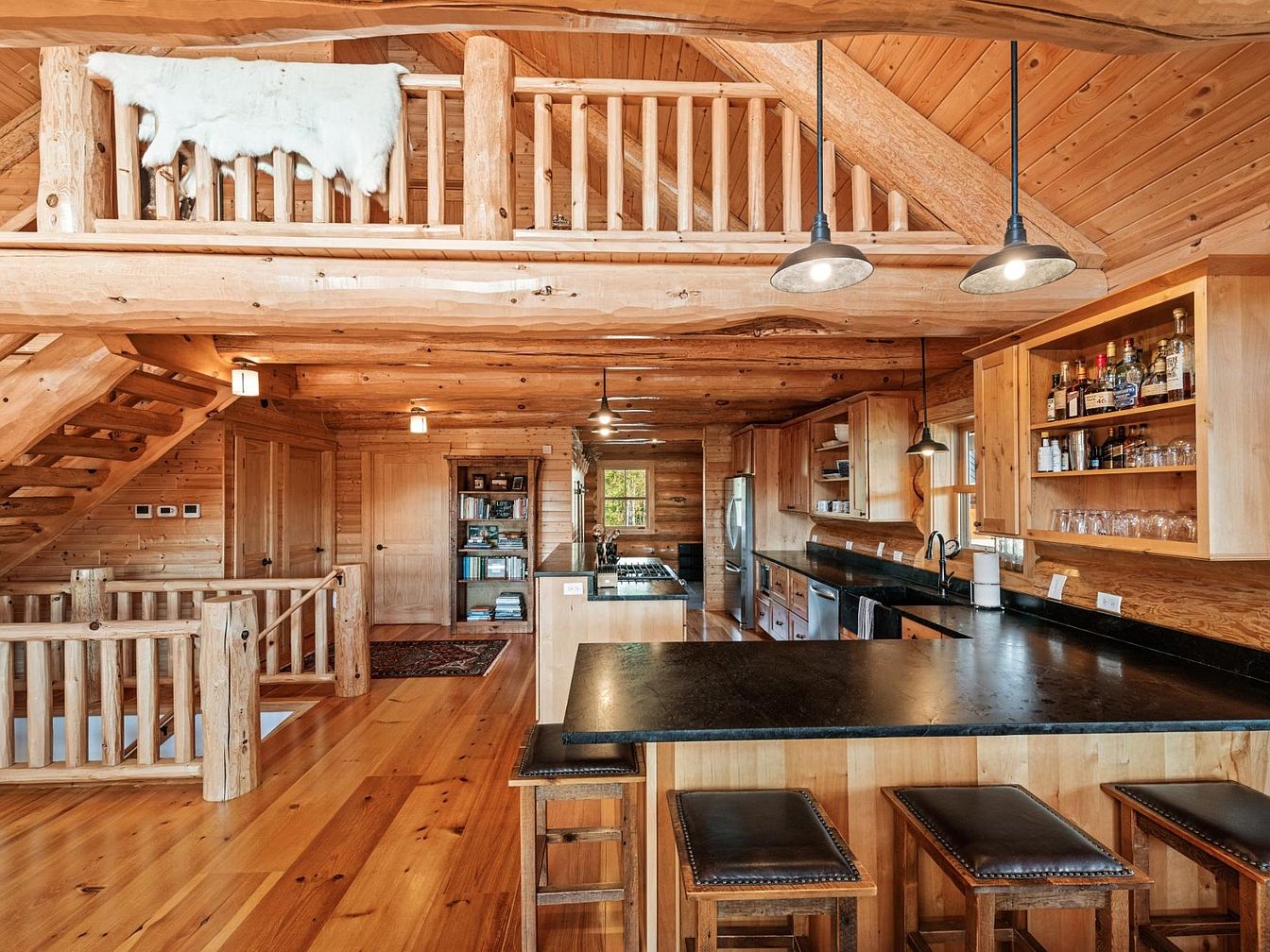 Warmth radiates throughout this open-concept kitchen and loft space, defined by rich wood paneling, log beams, and hardwood floors. The kitchen features black stone countertops, plenty of cabinetry, and an inviting breakfast bar with leather-cushioned stools, ideal for family gatherings. Open shelves display glassware and spirits, adding both utility and visual interest. Pendant lighting above the counter creates a cozy ambiance, while the surrounding log railings and staircase reinforce the rustic charm. Upstairs, a loft with a wooden balustrade and a white fur accent suggests a cozy retreat, making this area perfect for both lively family life and quiet moments of relaxation.