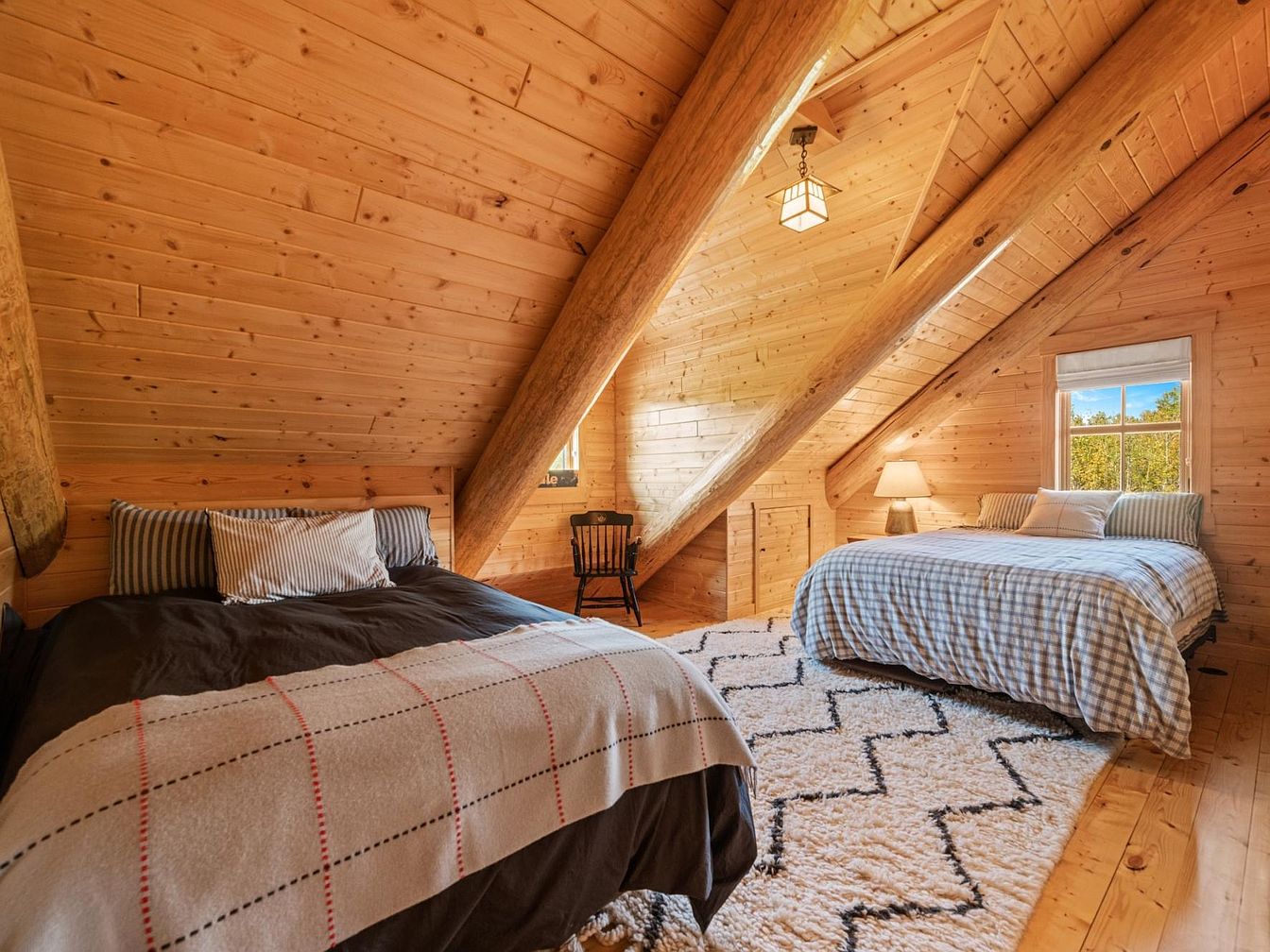 Warm wood paneling envelops this inviting loft bedroom, creating a rustic yet modern cabin atmosphere. The sloped ceiling with exposed beams adds architectural interest and coziness, while large windows bathe the room in natural light. Two spacious beds, each dressed in soft, patterned linens and plump pillows, make this an ideal sleeping space for siblings or guests. A plush geometric rug softens the pine floors, ensuring a comfortable play area for children. Simple, family-friendly furnishings such as a wooden chair and bedside lamp complete the look, emphasizing comfort, relaxation, and a welcoming ambiance for all ages.
