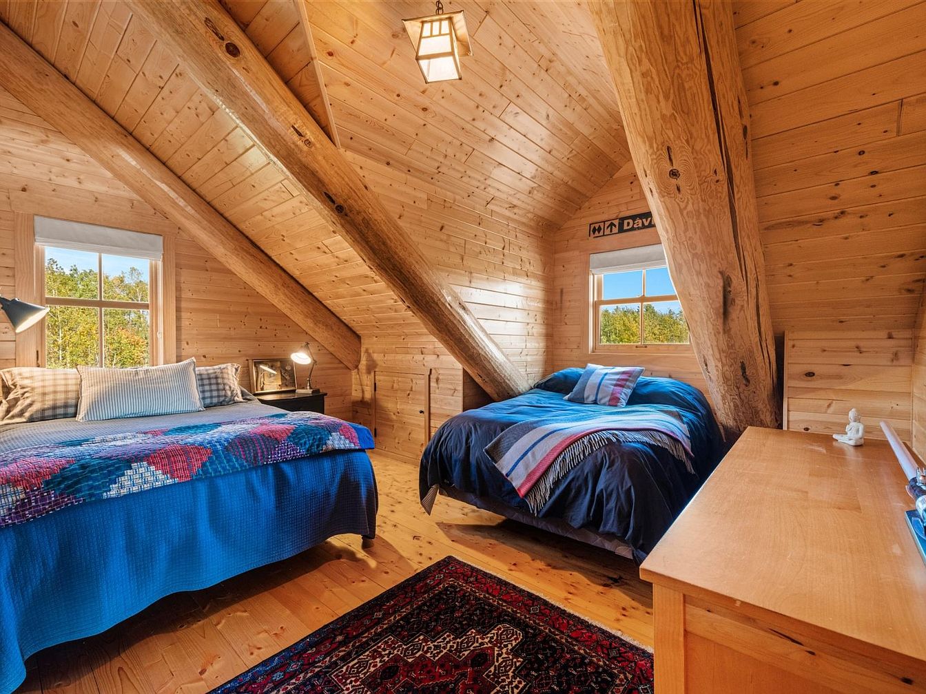 Warm wood paneling on walls and sloped ceilings sets a cozy, rustic tone in this loft bedroom. Exposed timber beams add architectural charm and character, creating an inviting, cabin-like atmosphere. Two generously sized beds with vibrant blue bedding make this space ideal for siblings or guests, perfect for families seeking closeness. Natural light pours through two windows, highlighting the natural wood grain and rugged-yet-refined ambiance. Functional family-friendly accents include a spacious dresser, a nightstand with a reading lamp, and a plush area rug providing warmth underfoot. The thoughtful layout maximizes usable space, making it both comfortable and visually appealing.