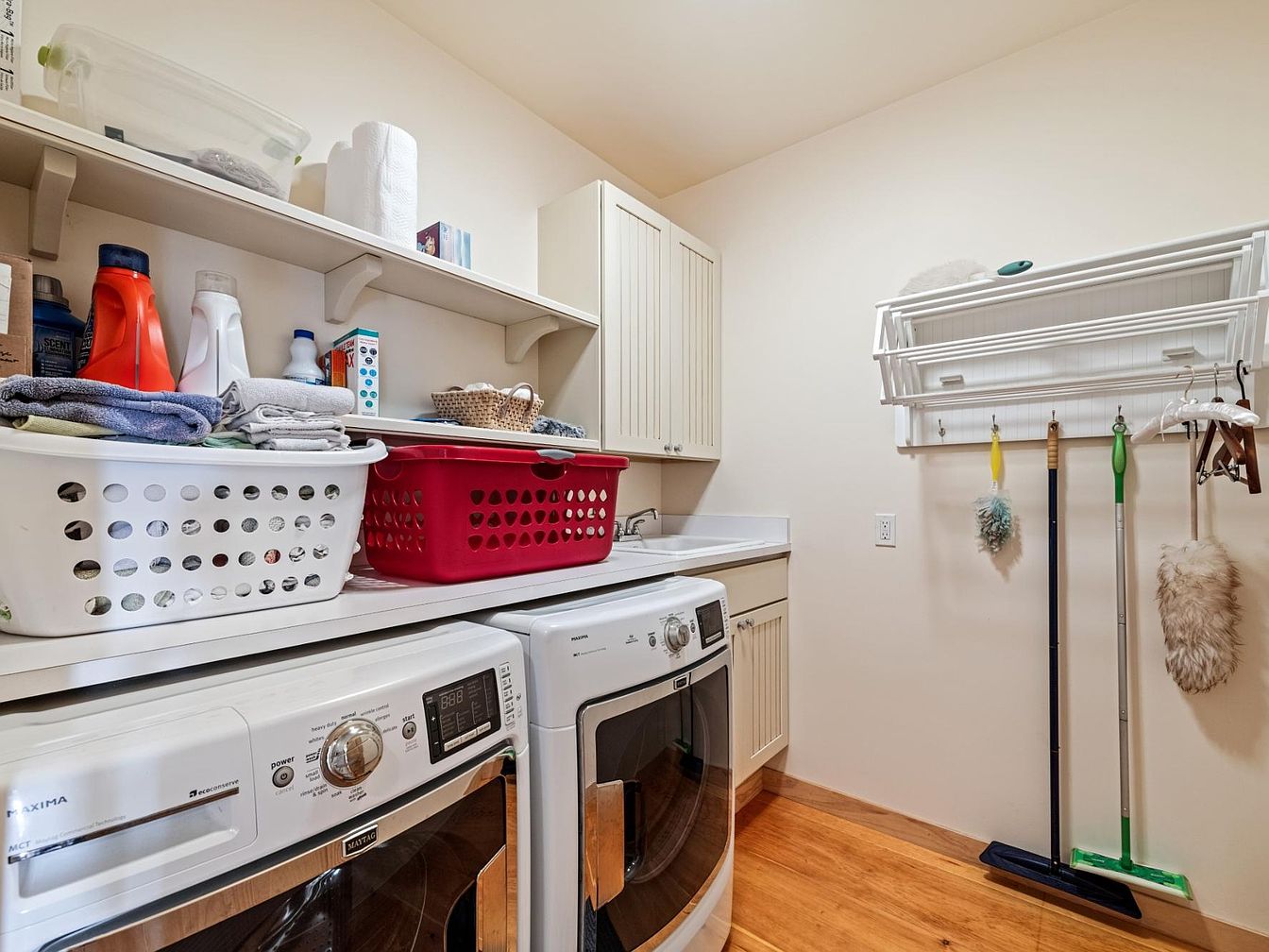 A practical laundry room with a streamlined layout, featuring a front-loading washer and dryer side by side beneath convenient countertops for sorting and folding. Open shelving above stores detergent, cleaning supplies, and laundry baskets, ensuring everything is easily accessible. A cabinet and an integrated sink add extra utility for hand-washing delicate items. Neutral cream walls complement classic wood flooring, creating a tidy and inviting atmosphere. Wall hooks and a fold-down drying rack keep cleaning tools and supplies organized and off the floor. Family-friendly features include ample storage, easy-access appliances, and a spacious counter for multitasking during laundry routines.