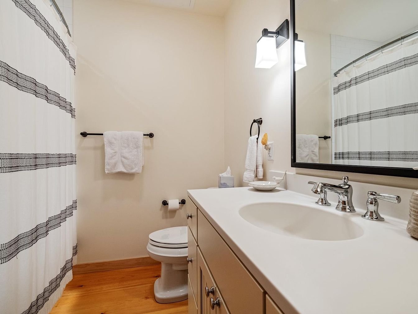 A bright and inviting bathroom offers a clean, family-friendly design with a neutral cream palette on the walls and cabinetry. The vanity features a smooth, white countertop with modern chrome fixtures, complemented by a large, black-framed mirror and contemporary overhead lighting. Pine wood flooring adds warmth and contrasts beautifully with the minimalist decor. A striped shower curtain and simple black hardware on the towel and toilet paper holders provide subtle contrast and visual interest. Ample counter space and accessible storage make this bathroom practical for family use, while plush towels and thoughtful accessories enhance comfort and convenience.