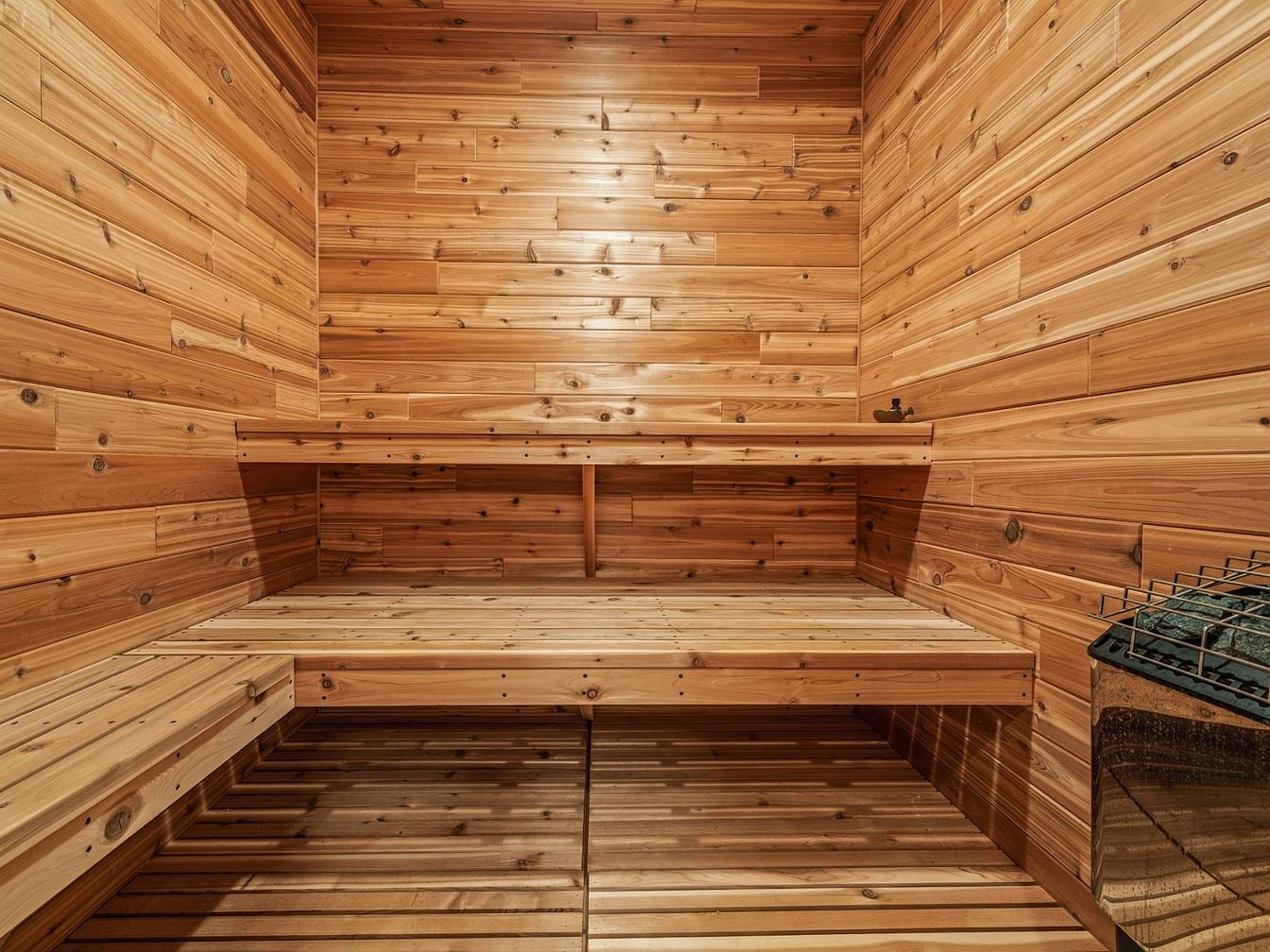Warm tones envelop this home sauna, crafted entirely with carefully set wooden planks that create a cozy and inviting environment. Bench seating lines two walls at staggered heights, accommodating both individual use and group relaxation. The overall layout maximizes space without sacrificing comfort, making it ideal for family wellness routines. A heater is tucked neatly into the corner, ready to envelop the room in soothing warmth. The natural finish of the wood enhances the tranquil ambiance and highlights the subtle grain patterns, creating a calming retreat that encourages togetherness and self-care in the comfort of home.
