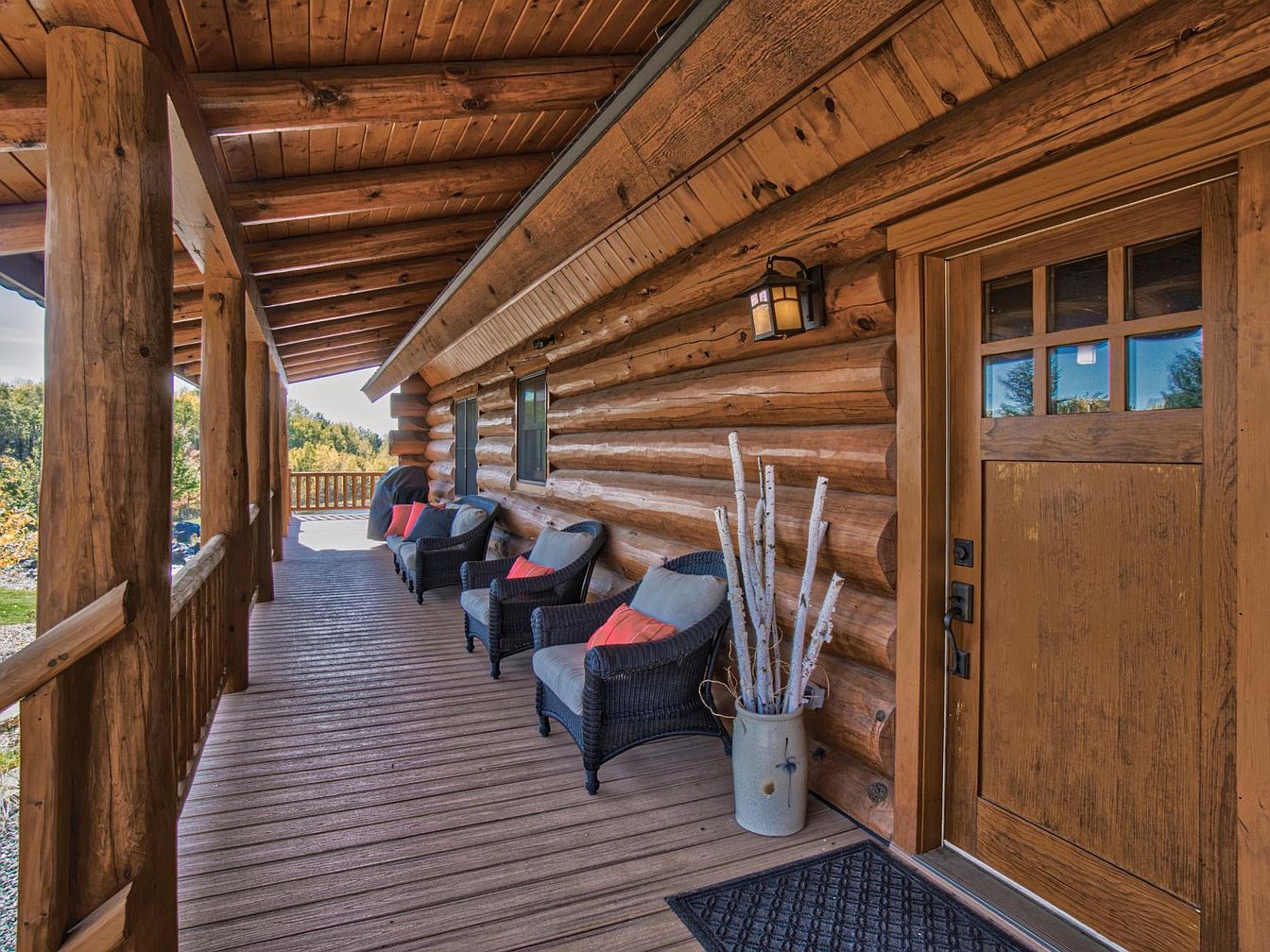 A spacious front porch crafted from natural logs creates a warm welcome with its rich wood textures and sturdy architectural beams. The covered walkway is lined with comfortable wicker armchairs, each topped with inviting gray cushions and vibrant red accent pillows, perfect for family gatherings or relaxing in the fresh air. Decorative birch branches add a touch of nature, while a rustic lantern provides soft lighting beside the solid, window-paneled front door. Surrounded by scenic views, this porch offers a serene, family-friendly retreat, blending seamlessly with the lush landscape and echoing the charm of a true log cabin home.