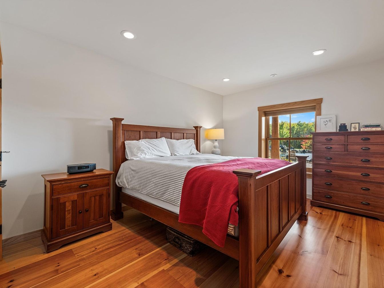 Warm natural wood tones set the scene in this inviting bedroom, where solid hardwood flooring and matching wooden furniture create a cohesive and welcoming atmosphere. The centerpiece is a sturdy bed with clean lines, complemented by an elegant nightstand and a spacious chest of drawers, perfect for organized, family-focused living. A large window frames views of lush greenery, filling the room with natural light and accentuating the bright, neutral color palette. Subtle pops of color, such as the red throw blanket, add personality without overpowering the serene ambiance, making this a family-friendly space for rest and relaxation.