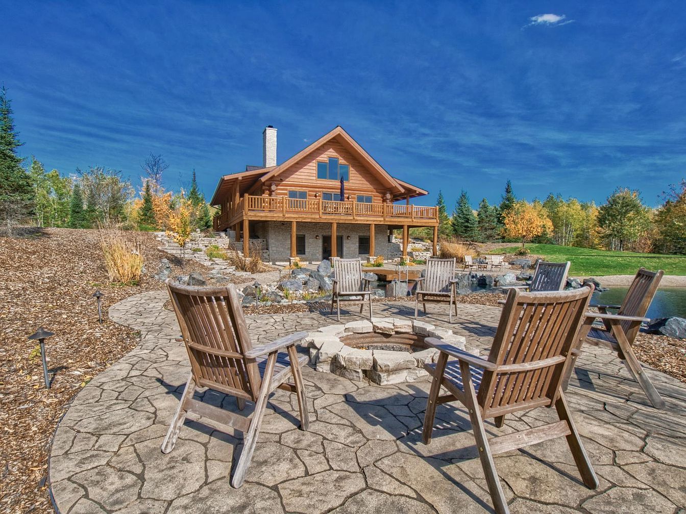 A spacious backyard retreat is centered around a circular stone fire pit, surrounded by sturdy wooden chairs arranged for social gatherings. The natural stone patio complements the rustic charm of the log cabin home, which features an expansive wrap-around deck and warm wood tones throughout its exterior. The landscaping is thoughtfully designed to blend with the surrounding natural beauty, with pathways, ornamental grasses, and pockets of native plants. This family-friendly space invites relaxation and outdoor fun, set against a backdrop of colorful autumn trees and a tranquil pond, ideal for memorable evenings with friends and family under open skies.