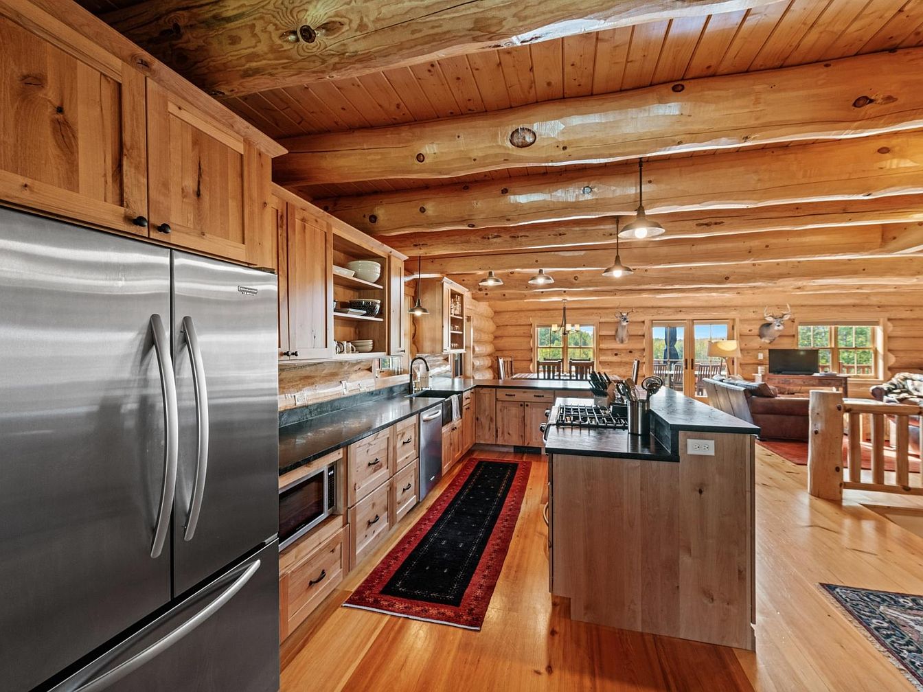 Warm, natural wood defines this inviting kitchen, featuring beautifully crafted log walls and exposed beams that contribute to a classic cabin aesthetic. Stainless steel appliances blend seamlessly with the rustic cabinetry, offering modern convenience in a charming setting. The open layout ensures visibility from the kitchen into the spacious living area, making it perfect for family gatherings and entertaining. A central island with dark countertops provides ample workspace and seating, while strategically placed pendant lighting keeps the space well-lit. Earthy tones, practical stone surfaces, and traditional rugs enhance the cozy, family-friendly environment, while large windows offer glimpses of lush scenery.