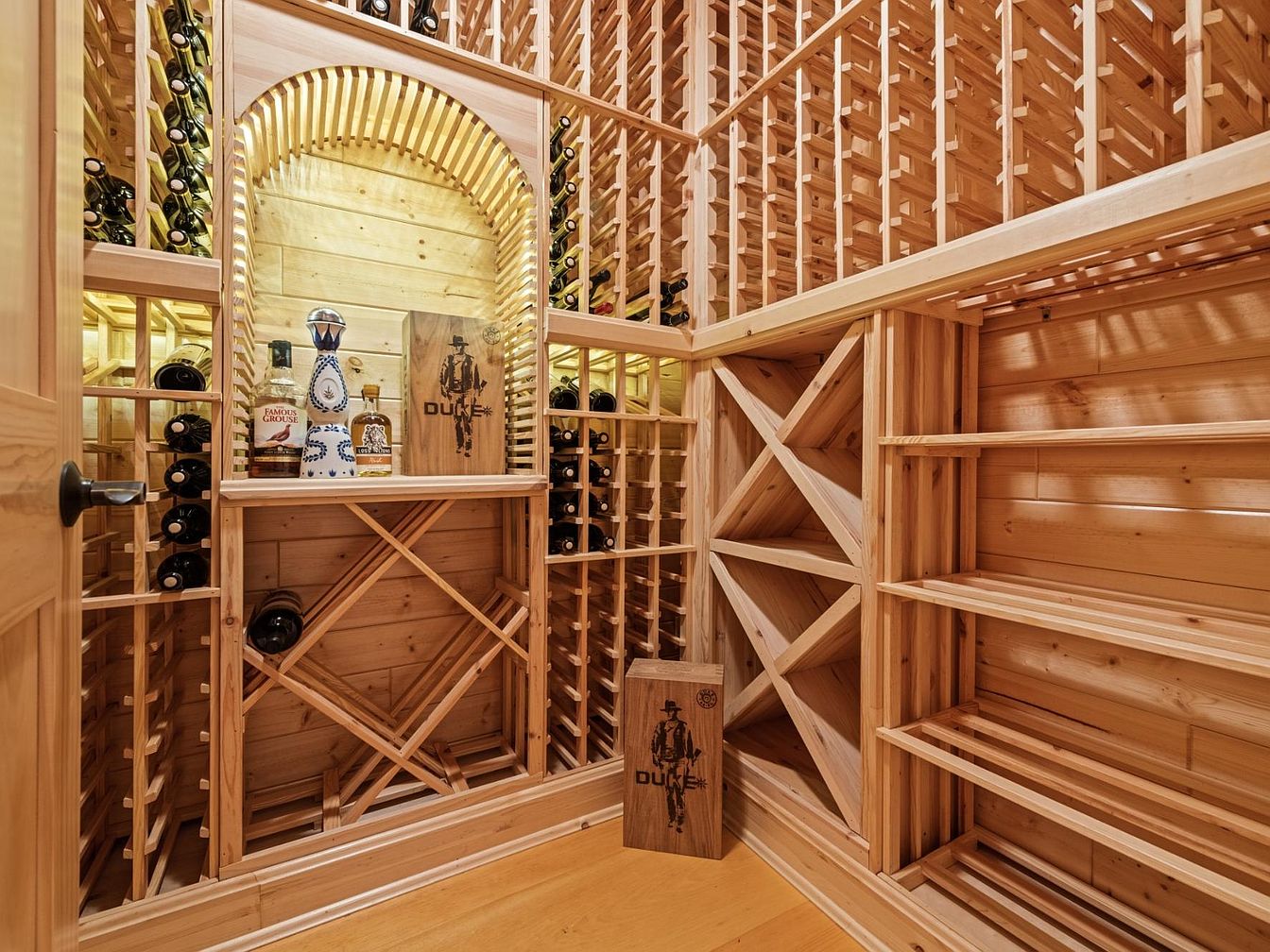 This wine cellar features custom-built wooden racks that maximize storage and display, offering a warm, inviting ambiance with its honey-toned wood finish. The arched display niche accentuated with subtle backlighting adds a focal point, ideal for showcasing special bottles and collectible spirits. Thoughtful compartmentalization provides both vertical and horizontal shelving options, making organization easy and accessible for every family gathering. The uncluttered, open floor and sturdy materials ensure safety and functionality, while the natural wood tones create a cozy, welcoming feeling. Architectural elements such as crisscross bottle storage and meticulous craftsmanship elevate this cellar’s luxurious yet homey appeal.