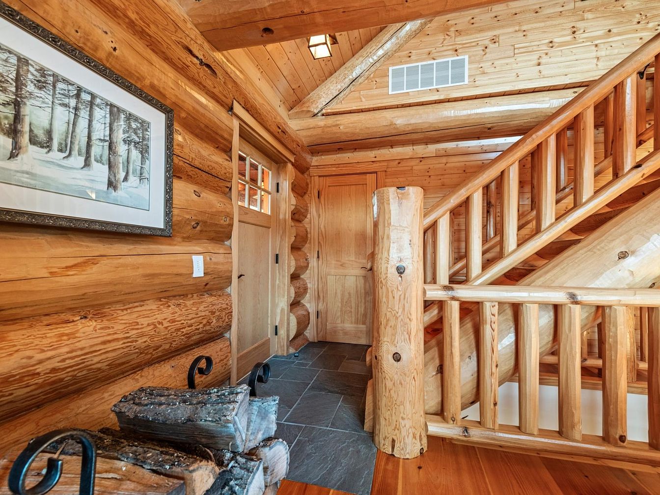 Warmth and natural beauty define this inviting entryway, where robust log walls and exposed beams create a cozy, rustic atmosphere. The slate tile floor offers a practical touch, ideal for busy families coming and going. A sturdy wooden staircase with chunky rails serves as a focal point, while a stack of firewood and wrought iron accents suggest both comfort and functionality. The color palette is dominated by honeyed tones of pine and cedar, enhanced by thoughtful decor like the framed winter landscape. Ample space and durable materials make this area perfect for welcoming children and guests alike, ensuring both style and durability.