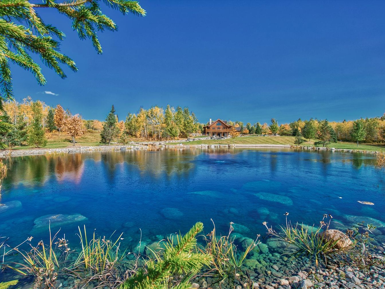 A stunning private lake lies at the heart of this property, offering a serene view of crystal-clear blue water surrounded by lush greenery and mature trees with autumn tones. The open space around the lake is perfect for family gatherings, picnics, and outdoor play. Architectural elements of the home in the distance showcase a classic American log cabin style with a spacious deck, blending harmoniously with its natural surroundings. Rolling lawns gently slope down to the water’s edge, providing easy access for fishing or lakeside relaxation. The tranquil environment invites both peaceful solitude and active family fun.