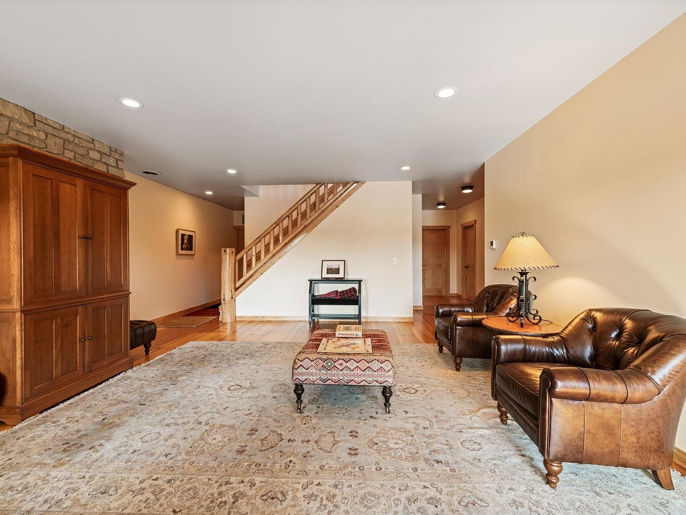 Warmth radiates from this spacious living room, where natural wood floors and earth-toned walls create an inviting atmosphere ideal for families. Two rich brown leather armchairs and a matching ottoman sit atop a large, intricately patterned area rug, offering cozy gathering spots for relaxation or conversation. A substantial wooden armoire provides practical storage and a timeless aesthetic. The room is thoughtfully illuminated by recessed ceiling lights and a decorative table lamp, adding ambient and task lighting. A charming wooden staircase with a rustic railing connects to the upper level, emphasizing the open concept and enhancing flow for both everyday living and entertaining.