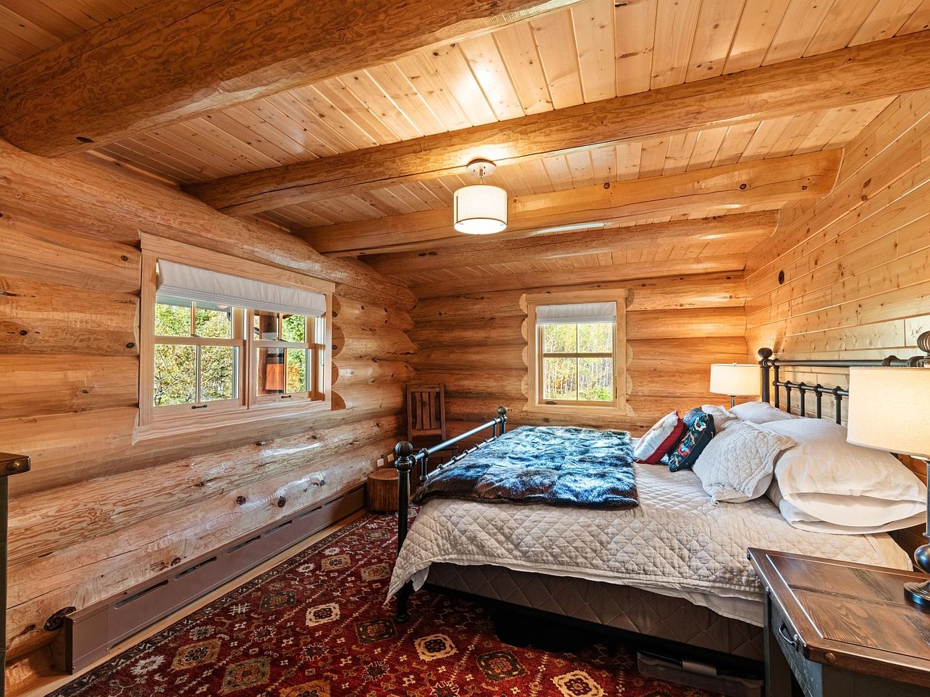 Warm golden pine logs and a wood-paneled ceiling create a charming, rustic retreat perfect for a restful family escape. The spacious layout features a queen-size bed with a sturdy iron frame, paired with soft bedding and colorful accent pillows for comfort and a touch of personality. Natural light streams in through two large windows, illuminating the detailed grain of the wood and the inviting space. Both bedside tables host reading lamps, providing a nurturing setting for both adults and children. A richly patterned rug grounds the room, adding color and coziness for family-friendly relaxation and bedtime routines.